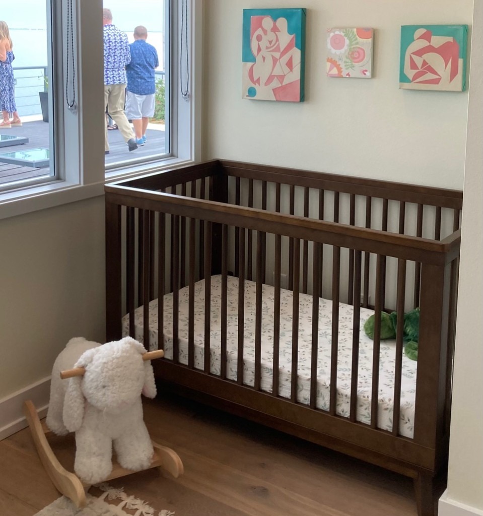 Three small pink paintings look down onto a baby crib, including, appropriately, a cubist-inspired oil by John Taormina entitled Family.