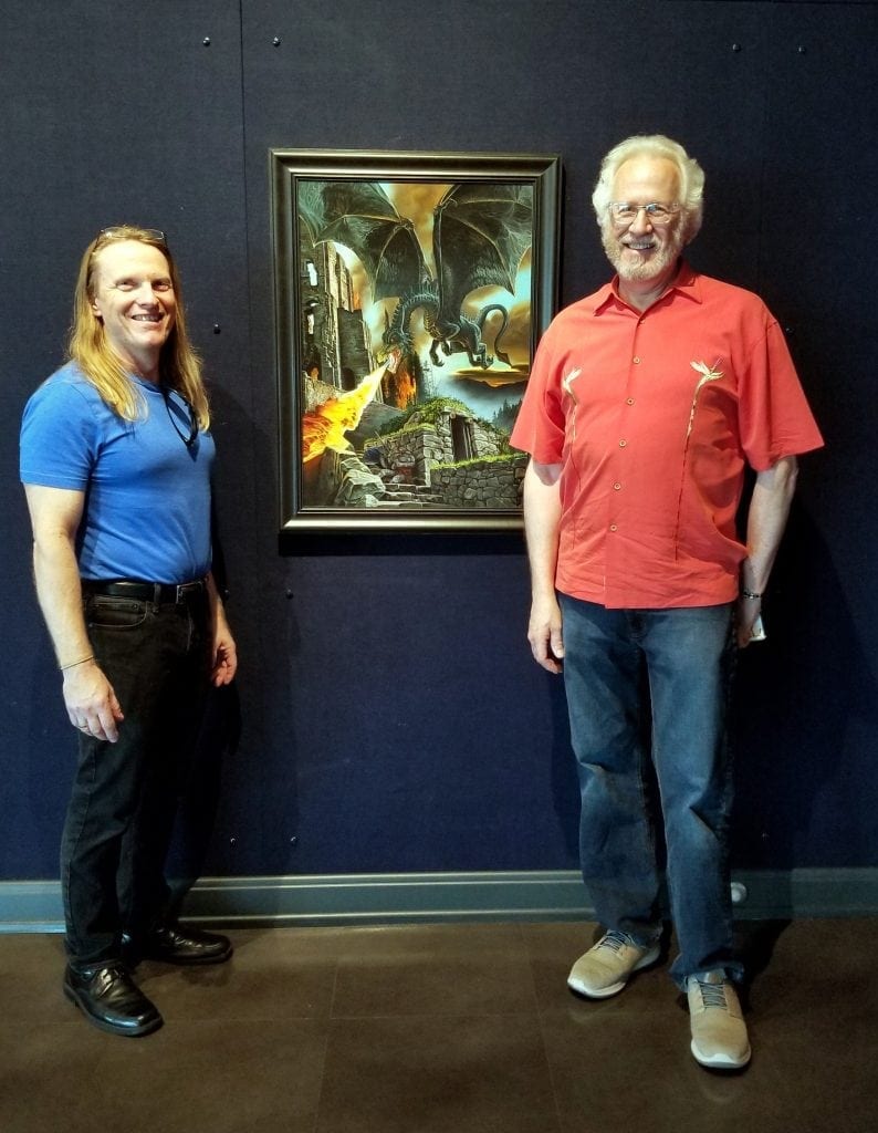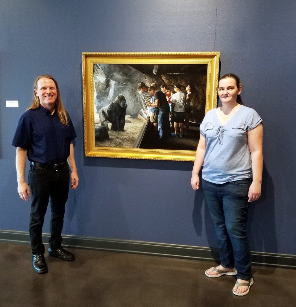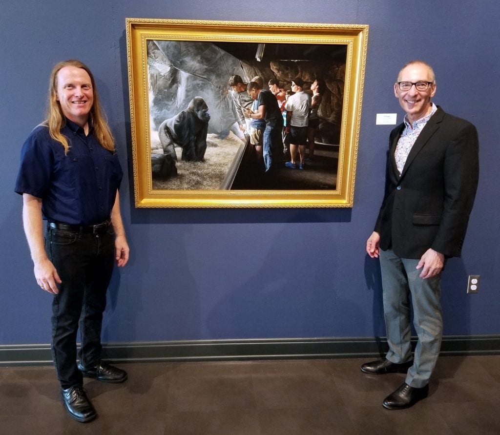 Kevin Grass and Paul Calendrillo pose next to the Primates painting at the Findlay, Ohio, art exhibition.