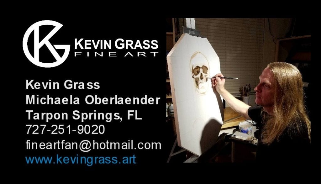 • Signage for the show. I have a clear acrylic sign with my logo and “Kevin Grass Paintings” on it that I had made for some international art fairs earlier that I may hang up. Ken also pointed out that I need to have signs for the daily Top 25 and the Final Top 25 (if applicable) to display by the work. I also need to mount the symbolism sheet that explains the iconography of the work next to the piece.This is the clear acrylic sign with my logo. I used “Paintings” instead of “Fine Art” because in the past some people thought my works were photographs since they are so realistic.