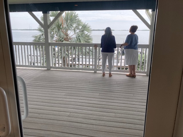 Two women enjoy the water view from the balcony on the second floor of Tampa Bay Watch in Tierra Verde before listening to Cynthia Barnett’s talk.