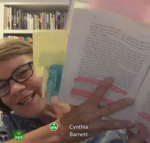 Cynthia Barnett holding up her well-marked book The Sound of the Sea: Seashells and the Fate of the Oceans as she searches for a passage to read at “Listening to Sea Shells,” Books & Books’ online book talk.