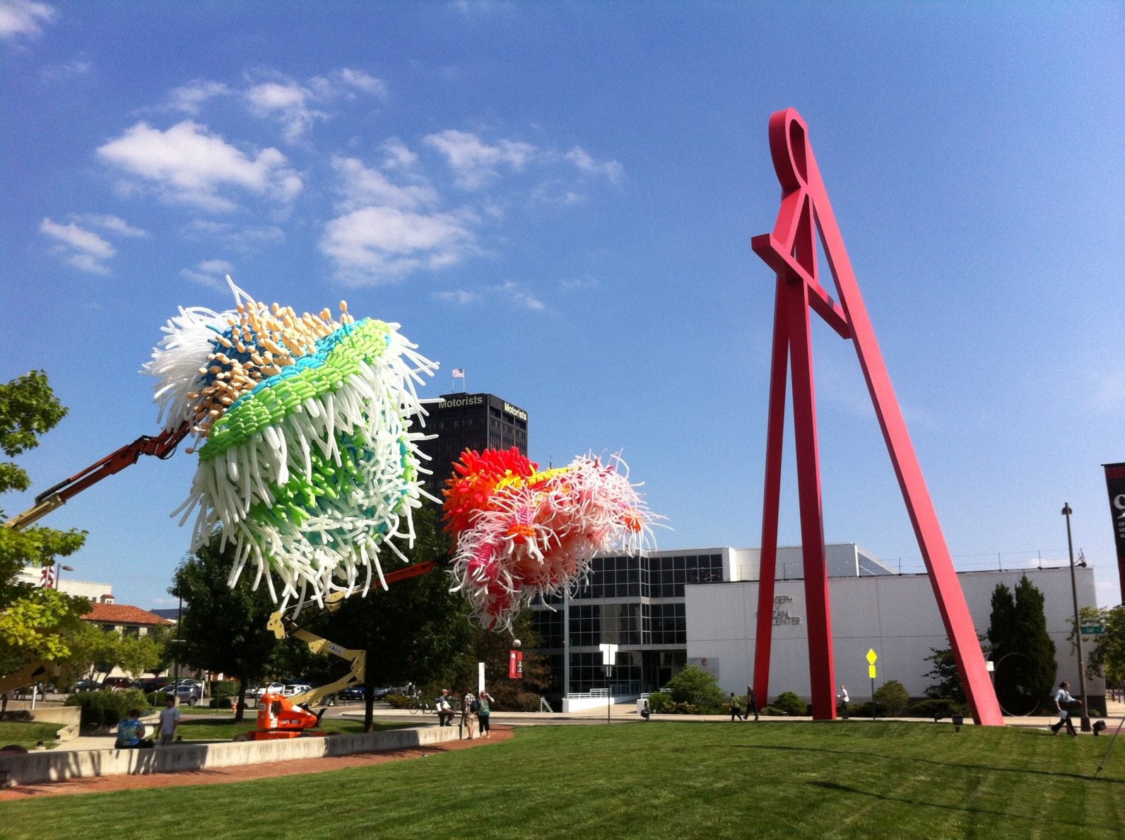 One of my favorite ways of showcasing my sculpture is to put them on articulating boom lifts and move them around in the air. I first had the idea back in 2008 and I proposed it to several curators and directors but didn’t get the green light until the director of Pop-Tech went for it at their conference in Maine back in 2011. See the video attached below. Since then, there have been several. Here are some images from those.
