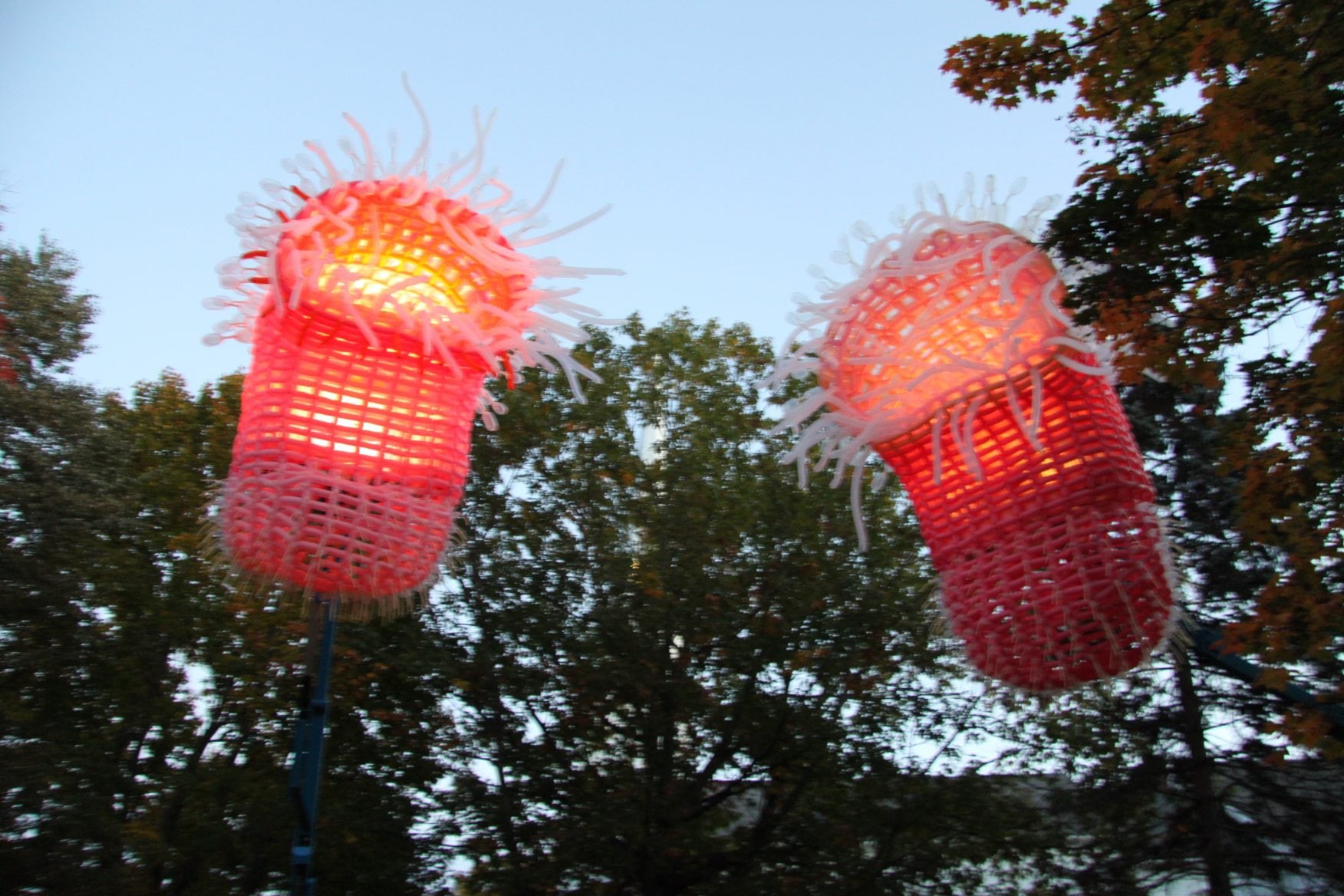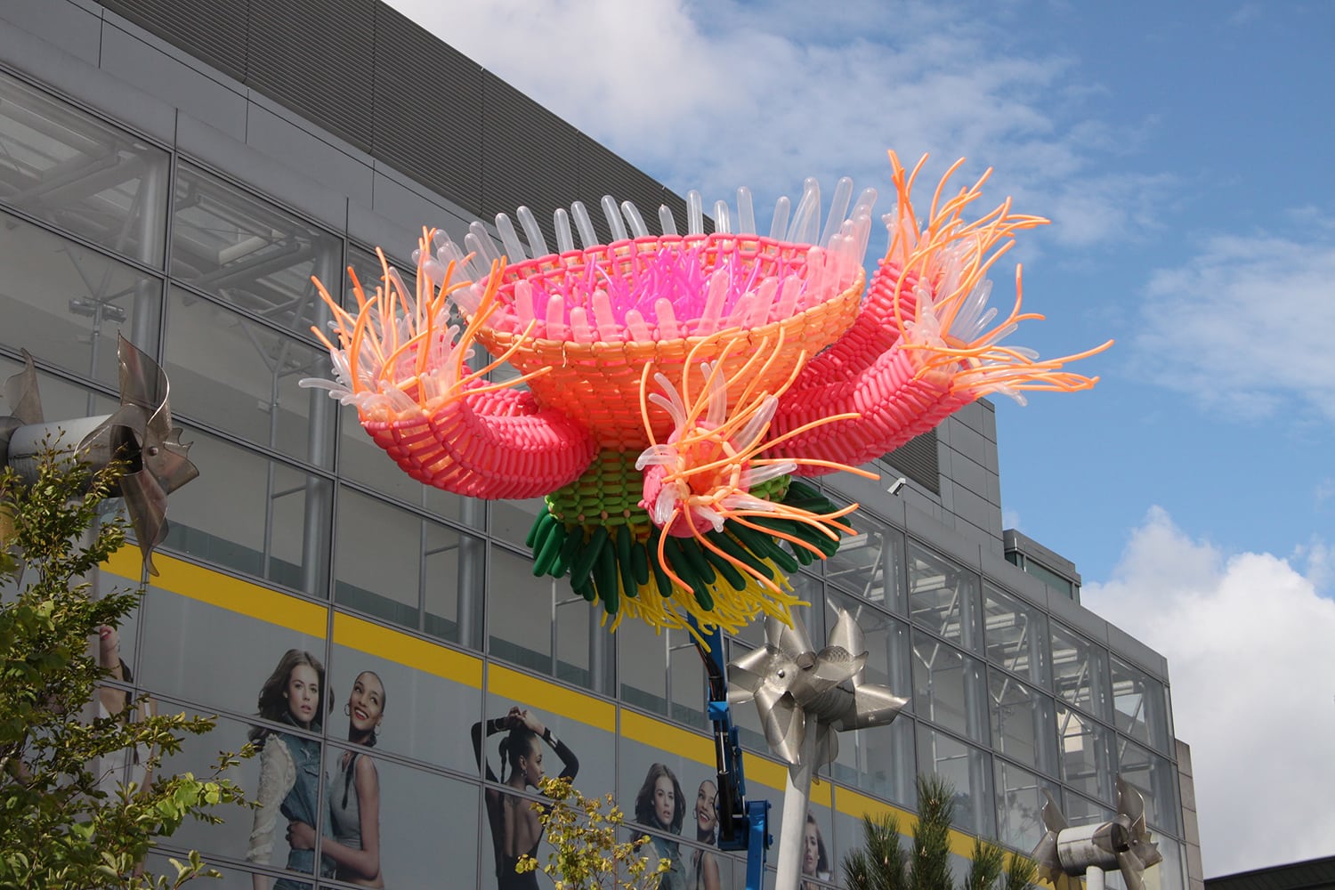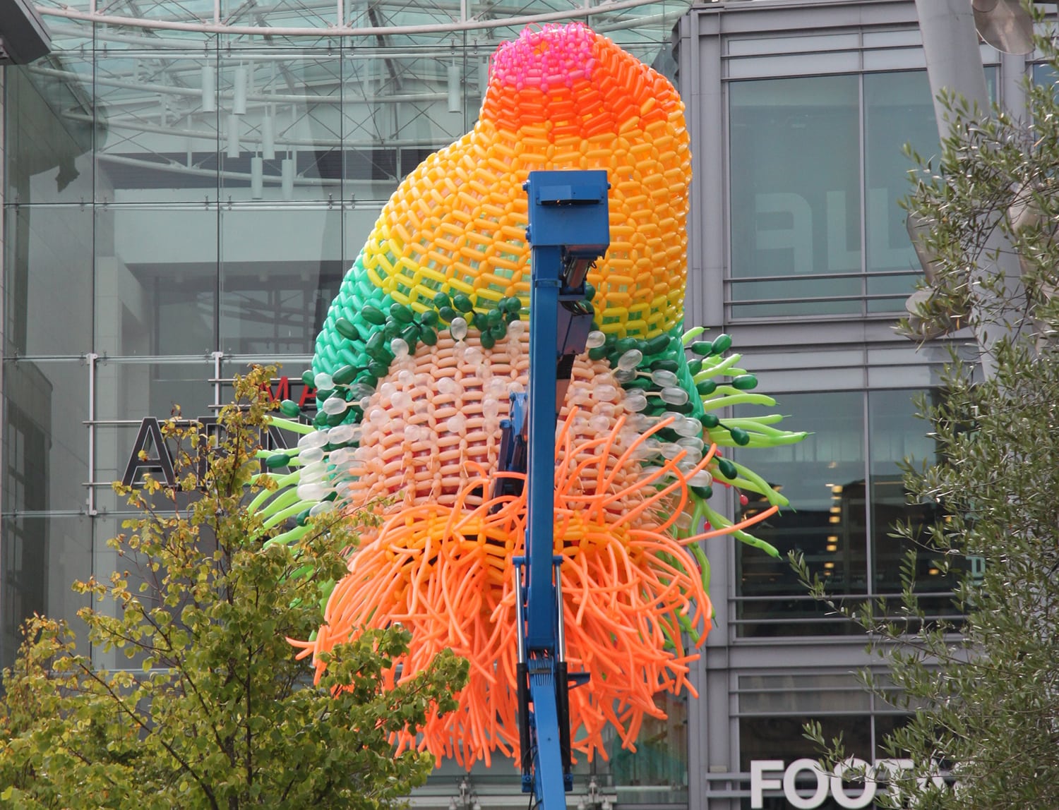 One of my favorite ways of showcasing my sculpture is to put them on articulating boom lifts and move them around in the air. I first had the idea back in 2008 and I proposed it to several curators and directors but didn’t get the green light until the director of Pop-Tech went for it at their conference in Maine back in 2011. See the video attached below. Since then, there have been several. Here are some images from those.