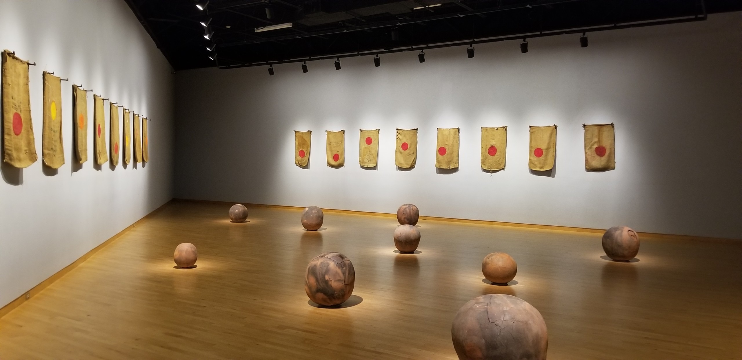 Surrounding these spheres are burlap sacks — used to store dry chili peppers — hung up on the walls. These art pieces are colloquially called, Sun Paintings. Each one has a distinct circle painted on them. Similar to the clay spheres, these painted circles vary in size, color and their position on the sack itself, which seem to represent the different positions of the Sun throughout the day.