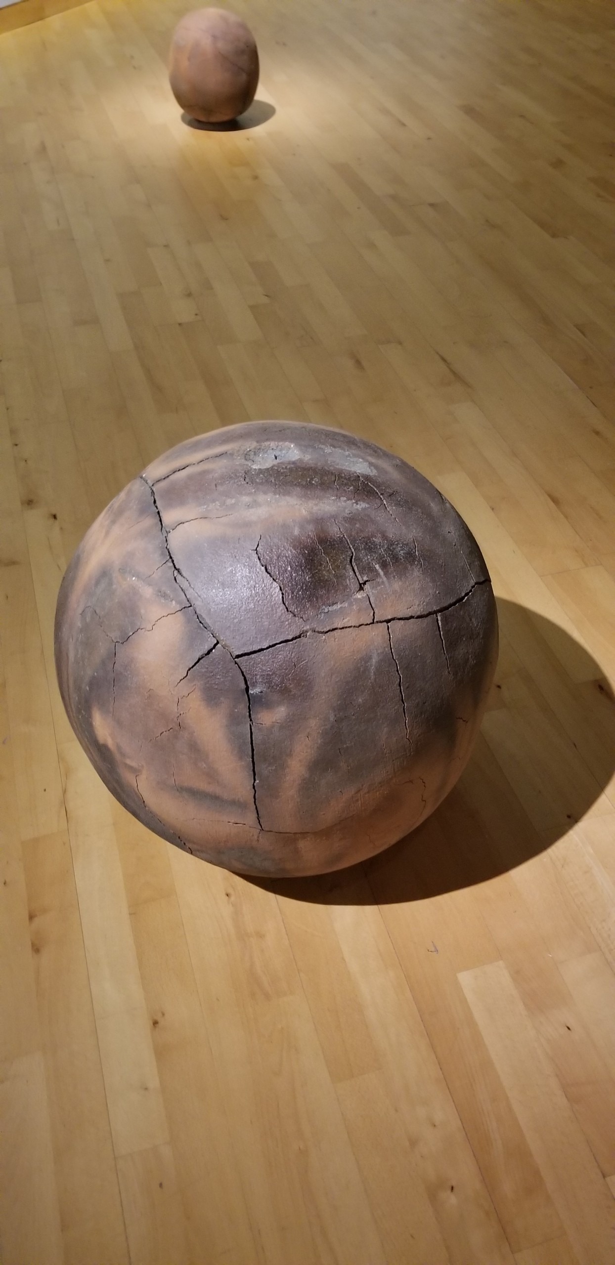 It’s hard for me to put into words the rush of different emotions I had while walking through this exhibit. It felt as if I was planting my roots back into the Earth as I marveled at the cracked clay spheres placed meticulously on the gallery floor. Each one taking on a distinct look thanks to their different sizes, patterns and slight color variations.
