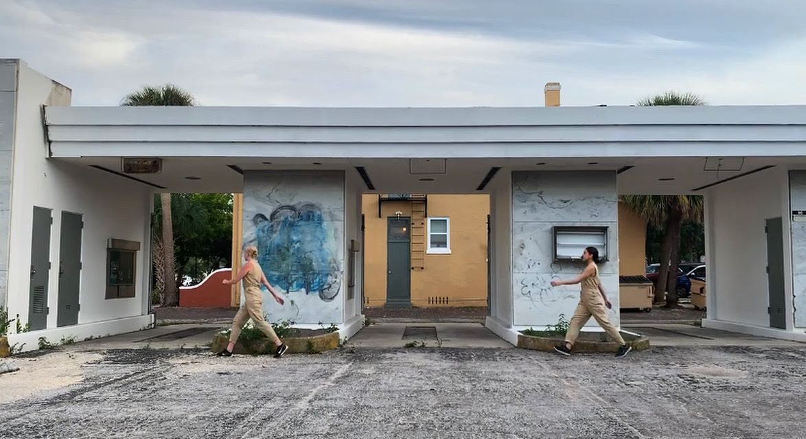 Brewer originally premiered hot walk, then titled ellipses, as a part of projectALCHEMY’s annual Momentum Showcase in fall 2019. The piece took place outside in the abandoned bank teller booths that join with Studio@620’s space. Dancers Carissa Bishop and Kirsten Standridge walked tandem circles in khaki jumpsuits, gravel shuffling underfoot as their backlit figures cycled again and again.