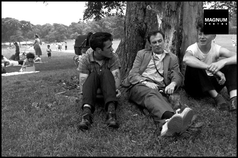 USA. New York City. 1959. Brooklyn Gang. Junior (L) with Bruce Davidson and unidentified person (R) in prospect park. 1959.