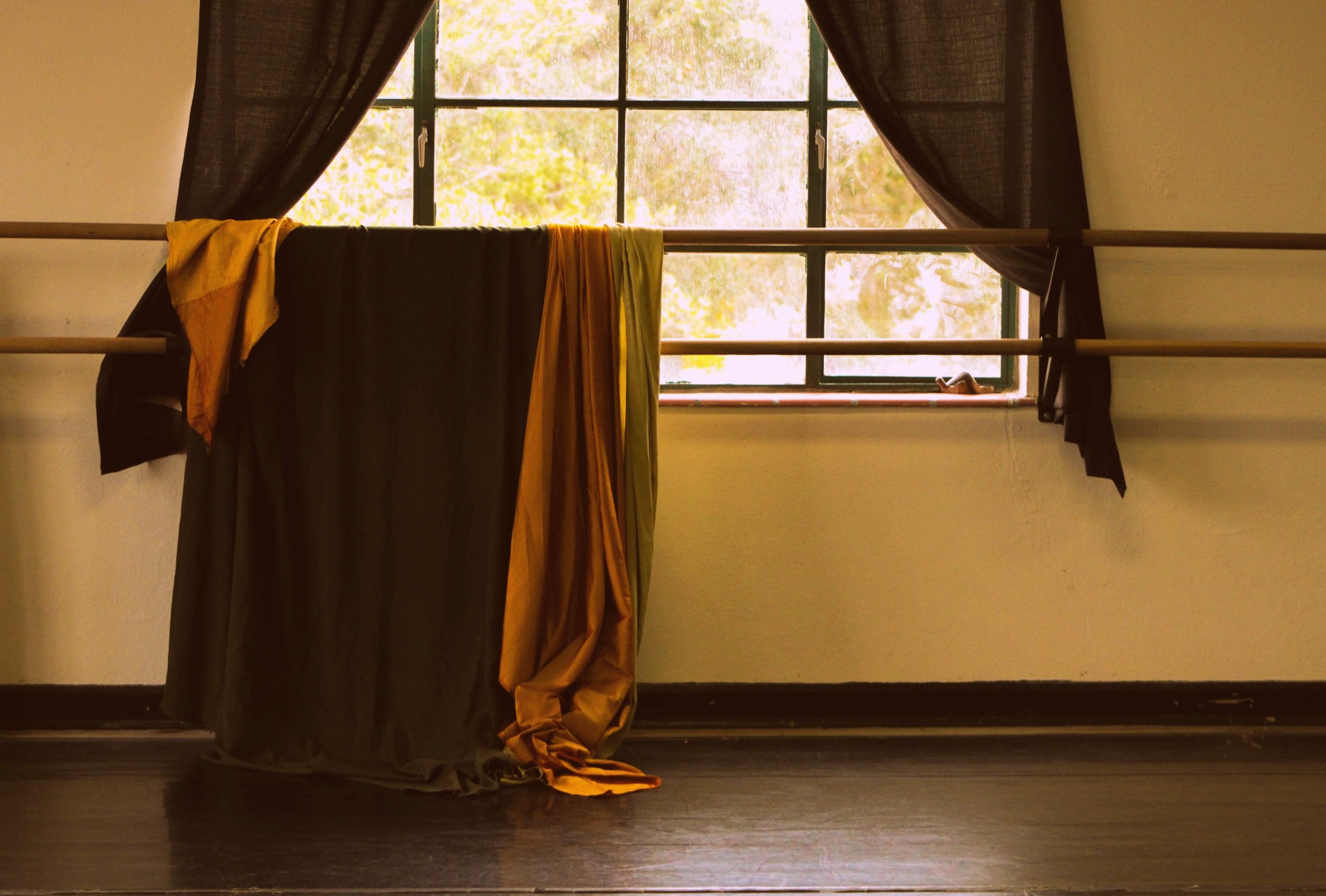 Another standout is the photograph Left Hanging by Erin Tindol. On its own it is compelling for its rich color and slightly off-centered sensibility. It is unique in this setting because it is the only photograph that doesn’t include a dancer. We see a dancer’s barre with fabric draped over, and a curtained window behind. There is no body, and yet you sense the energy of the dancers who have held that barre and stolen glimpses out that window. Tindol is a painter as well, and this photograph definitely shares a painter’s aesthetic.