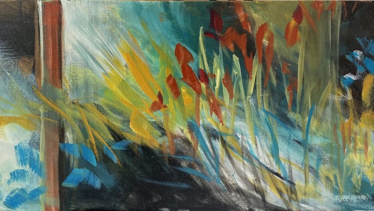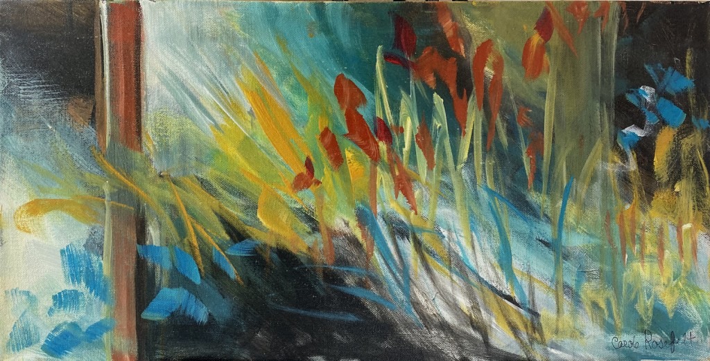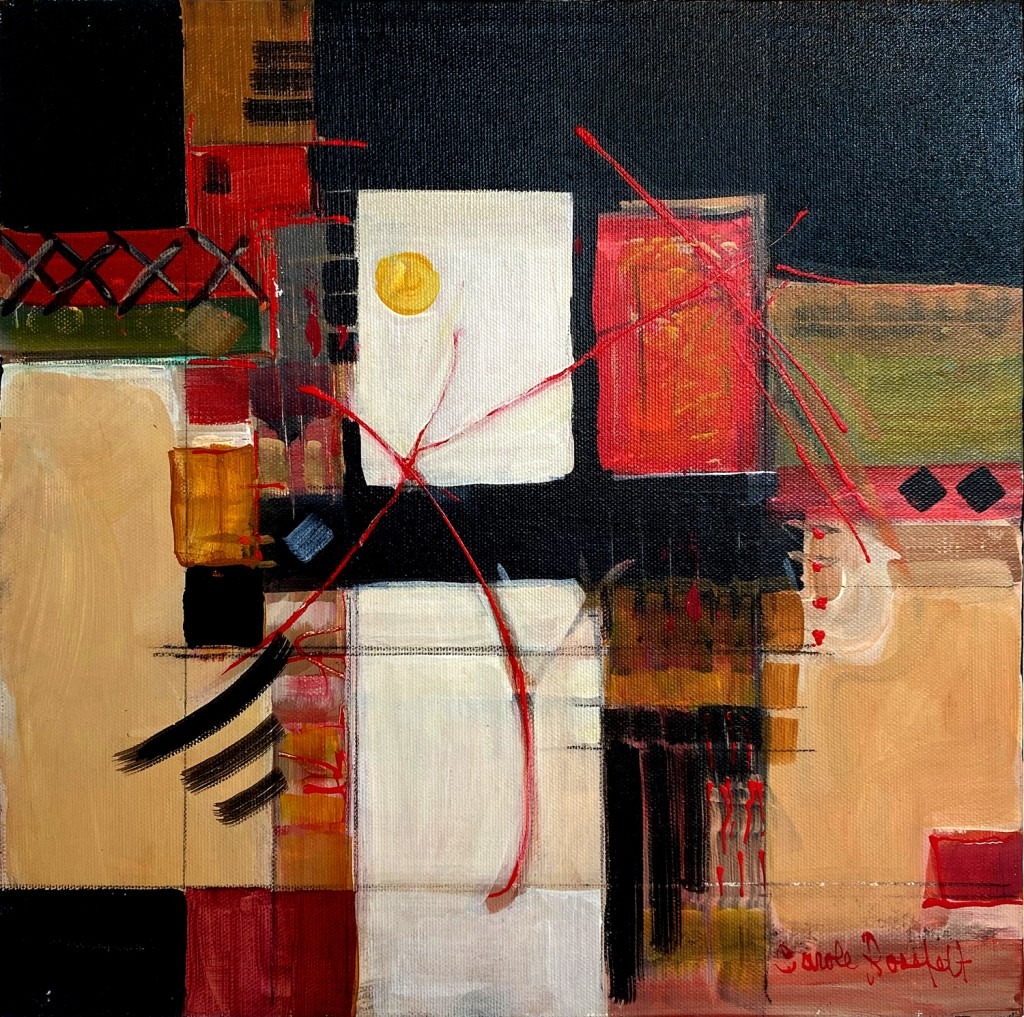 The current exhibition of Carole’s Bold Abstracts is a slice from her artistic life. These are large contemporary canvases that explore geometric composition with a touch of nature using mostly red, yellow and turquoise.