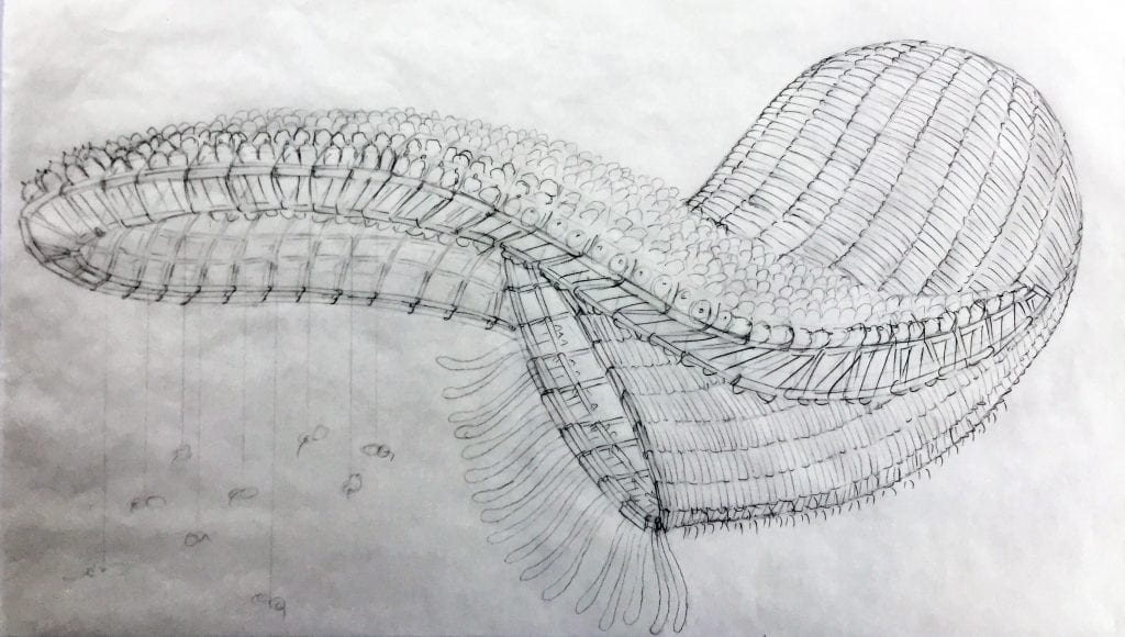 From the structural connections of the canapé will hang dozens of strands of monofilament. From each strand will hang a single amoebic like form made from one clear and one neon green balloon. A light air current should have then all moving like an activated swarm just overhead of visitors. The intention of the piece is to appear as if the organism-like danglers are being dumped or perhaps birthed from the open vessel like a great test tube dumping its living experiment, or maybe a giant strange fish that has released its babies from its gaping mouth.