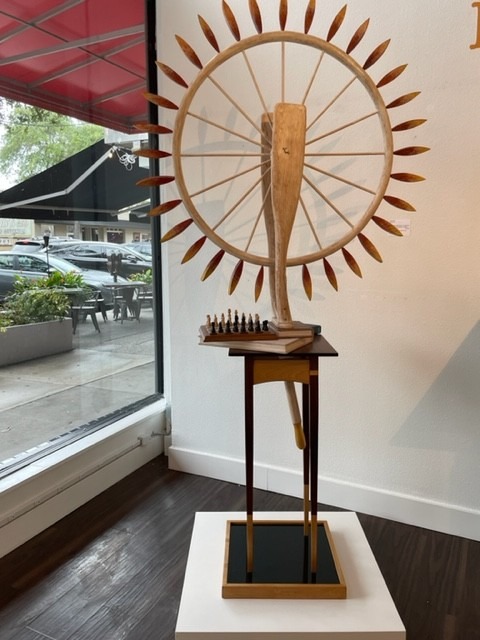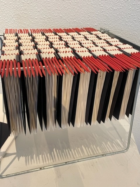 Bower’s “phone book” is a sculpture made from a metal office file holder and a series of black, white and red books. Dana called it, “a celebration of the craftsmanship of piano-hinge book binding. . . an intricate painstaking process.”
