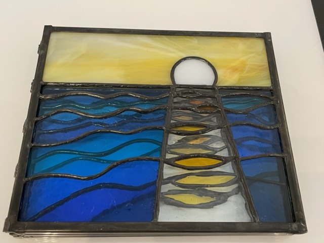 Three hinged plates of constructed stained glass