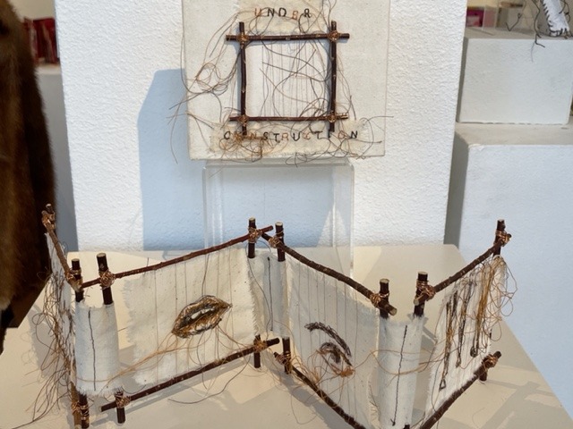 Willow sticks, copper wire, drawing transfer on fabric