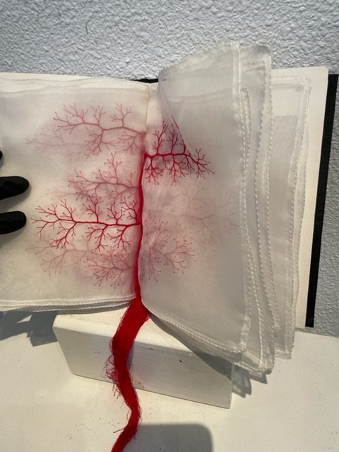 Day’s bound book with organza pages beautifully and finely embroidered in red thread referencing blood vessels (sounds strange but it works) was delicately gorgeous.