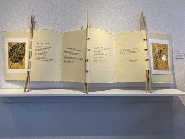 This six-foot wide, bamboo piano-hinged book was inspired by a poem written by Prins’s late son, Jaro Majer. It was constructed of handmade paper with nature prints from tree and plant leaves with the poem hand-lettered by the artist. A lovely tribute.