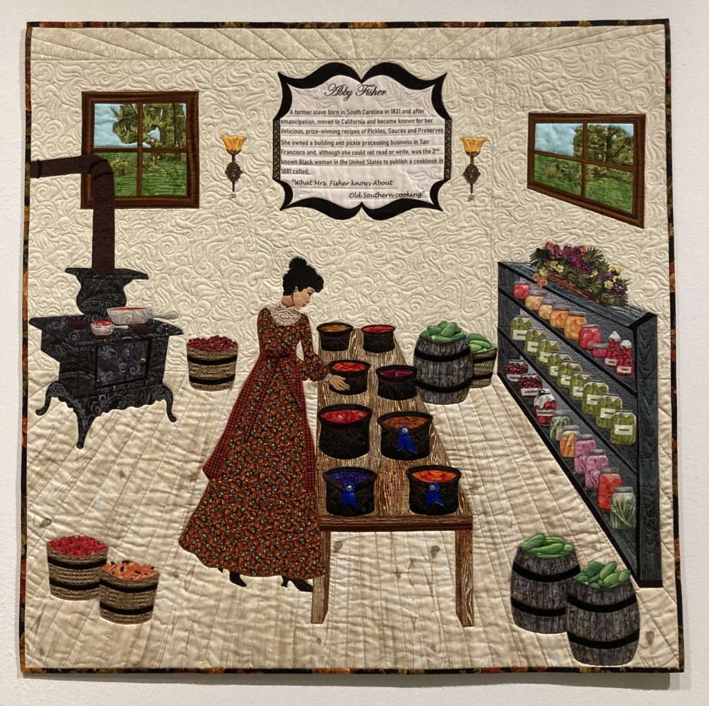Barbara McCraw, a quilt maker of Waller Texas, for example, tells the story of Abby Fisher, an award-winning chef and businesswoman who was born in 1831 to a slave mother and a white farmer. In the 1870s she opened a pickle and preserve manufacturing company in San Francisco based on her recipes and later produced the first cookbook by a Black woman. The exhibit runs through January 8.