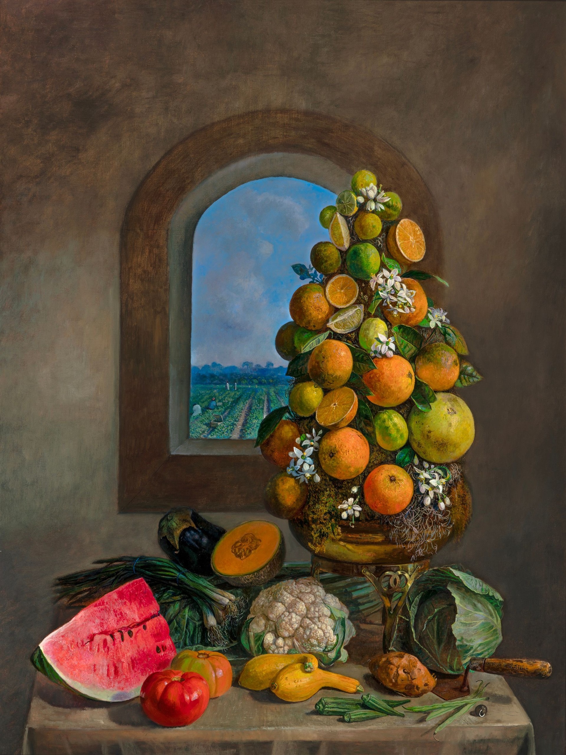 Florida Harvest is the earliest painting in The Great State of Florida exhibition and is an example of Still’s interest in Florida’s flora, fauna and history – in what he calls “story paintings.” Representing Florida’s bountiful harvest, it references specific sites associated with the citrus industry in Pinellas County.