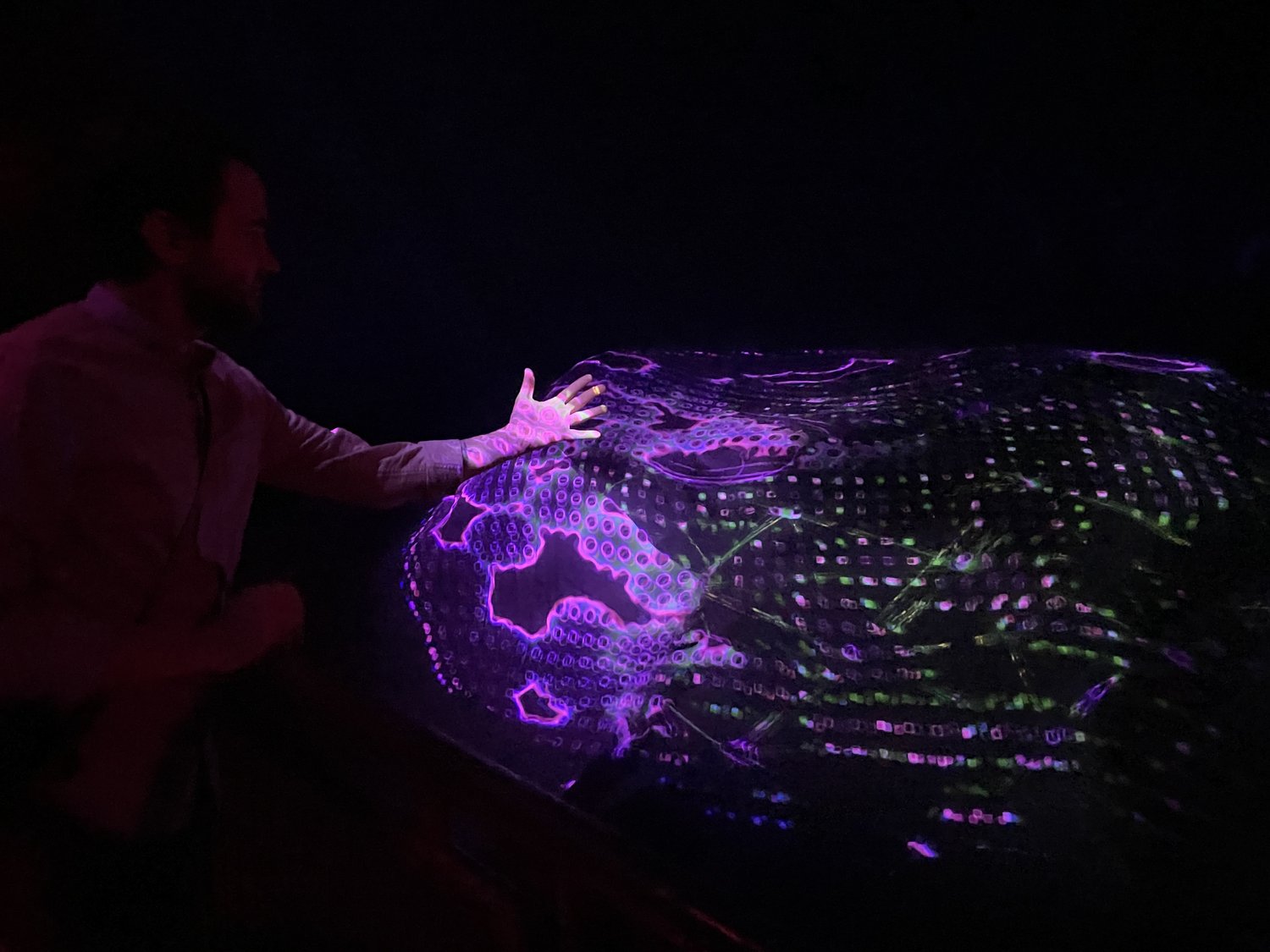 Another generative artwork I recently completed is located at Meow Wolf in Las Vegas. Metaworm evolved through my creative exploration of the interplay between natural and artificial systems. The work explores the emergence of digital nature through creative coding. Using a blend of physical fabric in motion with interactivity, generative graphics and sound, the media transcends reality when it mushrooms into a billow of chaotic flurry that feels lifelike.