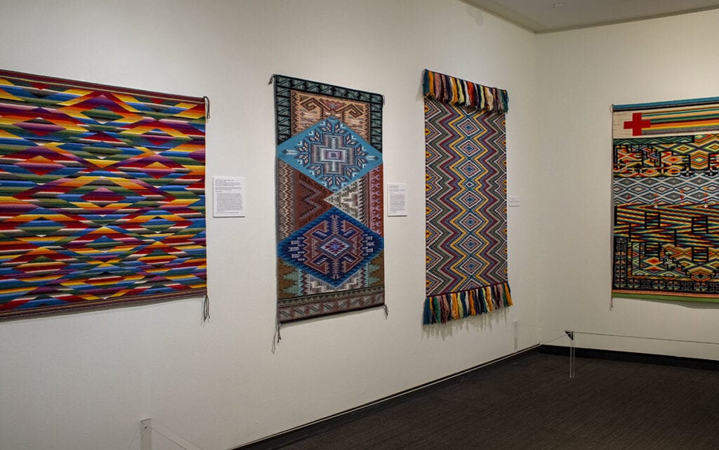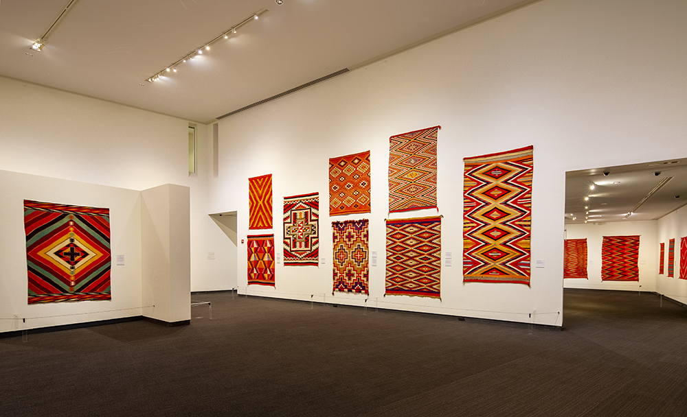 “The textiles presented in this exhibition are creations of weavers who wove for themselves — they are vibrant and unrestrained in both color and design. They were woven after a time when Navajo men, women and children were themselves marched hundreds of miles out of their homeland to be held in an internment camp.