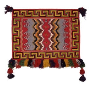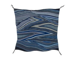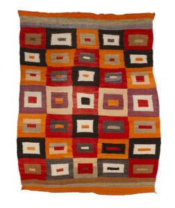 ‘Transitional’ then takes on several meanings. It’s a threshold moment, from traditional labor-intensive yarn spinning and dyeing to purchasing industrial yarns. But the time-consuming weaving process continues – from simple bold patterns to more complex use of colors and designs. . . from the traditional tribal life, to surviving interment camp life, to learning how to navigate the influx of foreign settlers in and around their homeland. . . from inter-tribal trading to wider commercial ventures. . . from artisans to artists.
