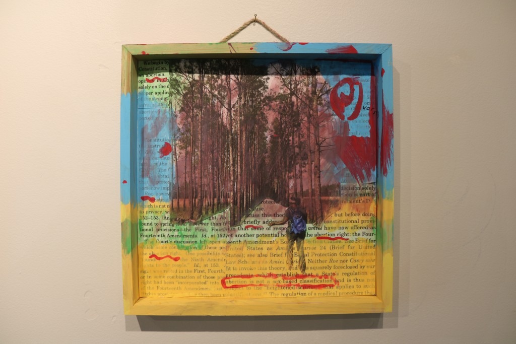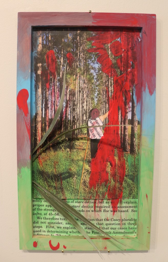 Using a mixed media approach combining images of a wooded area of Tampa that she hikes in, with tree sprigs and text, she contrasts the “space that I feel so free in, with this language that was making me not feel free.”