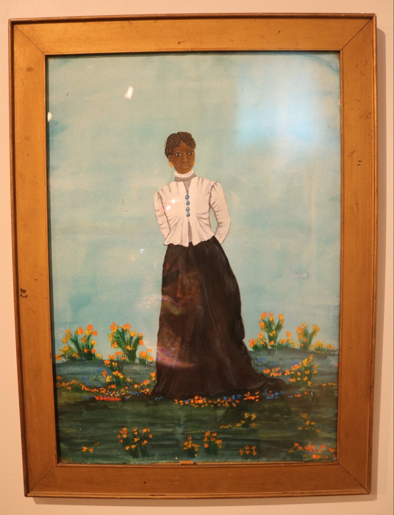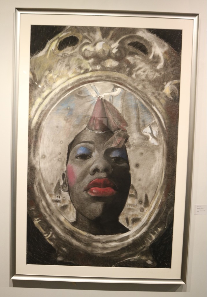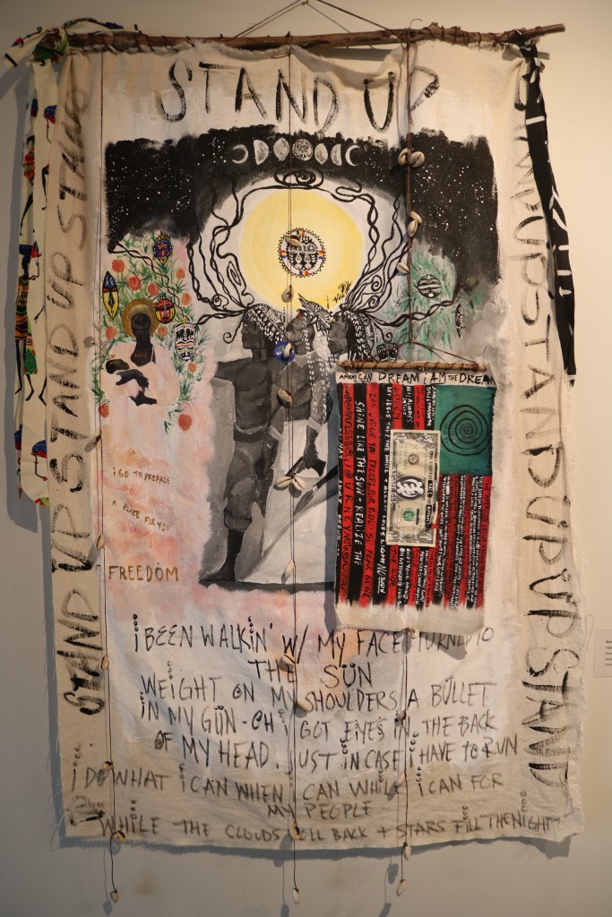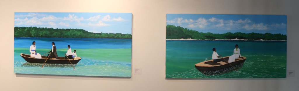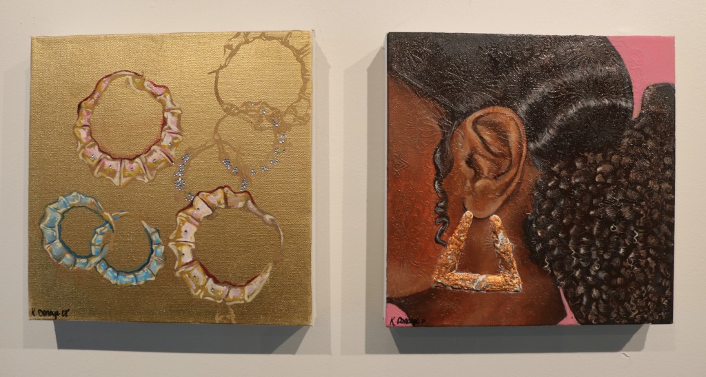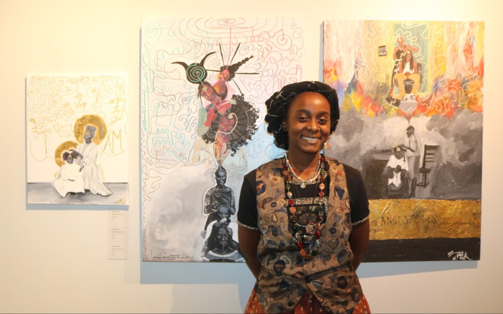Myiah Moody, the youngest artist on display, comments on a trio of paintings titled, I am My Ancestors’ Wildest Dreams. Her pieces are “inspired by the fact that the next generation is always finishing up the dreams of the last generation – our ancestors may have had dreams that they didn’t get to execute in their time here, but those ideas never left, they’re just passed on to us.”