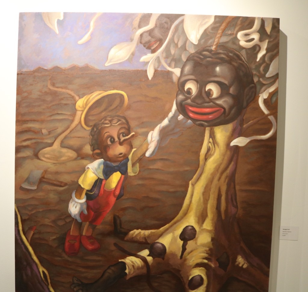 Freeman notes that using iconography allows others to access a piece and make their own connections to it. “People recognize some things, they start to relate to it, and then begin creating their own stories as well,” he offers. ”For me, the works are also subversive,” he adds, noting that contrasting familiar characters, like his Black Pinocchio, with the bizarre figure of an anthropomorphized tree in the painting Strange Fruit is both alarming and encourages the viewer to consider more thoughtfully the messages within the piece.