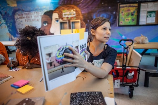 Instructor Kinsey Rodriguez shows examples of street art. Photo by Todd Bates.