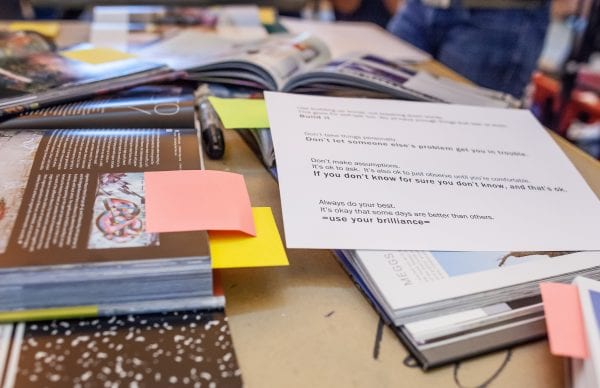 Bookmarked magazine and illustration books cover the rec room table along with some inspirational messages from Boucher. Photo by Todd Bates.