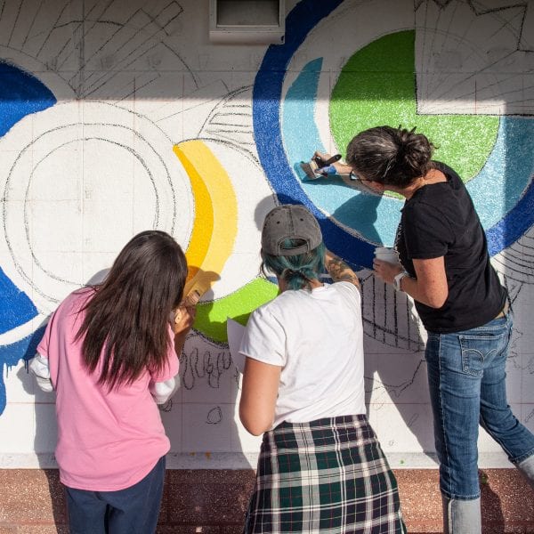 A JDC inmate assists Rodriguez and Boucher in the creation of the JDC mural. Photo by Todd Bates.