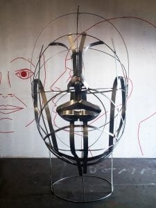 After 17 days of work, the piece it is 60% done. It has absorbed almost all of the 550 linear feet of stainless stock earmarked for its construction. The proportions are balanced, and the woven web of steel lines become tighter towards the face and looser in the back and top of the head.
