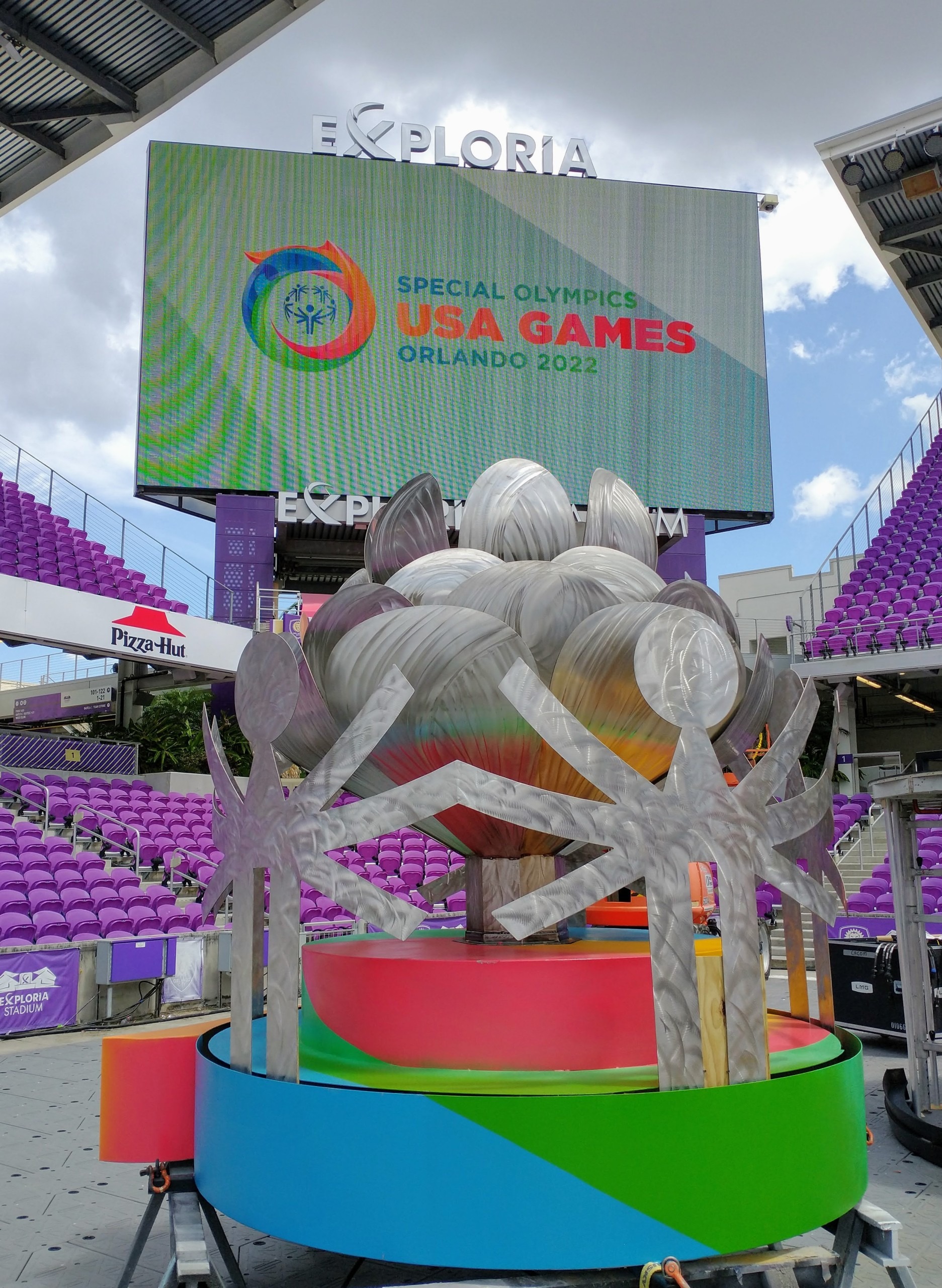 The cauldron was installed in three separate venues, Disney-Explora Stadium, Wide World of Sports for the games, and then its final home in Orlando. All this transport, installing and de-installing had to take place within a three week timespan. ESPN, Wide World of Sports, Disney, the City of Orlando and the USA Games Olympic Committee, all had demands and input into the project.