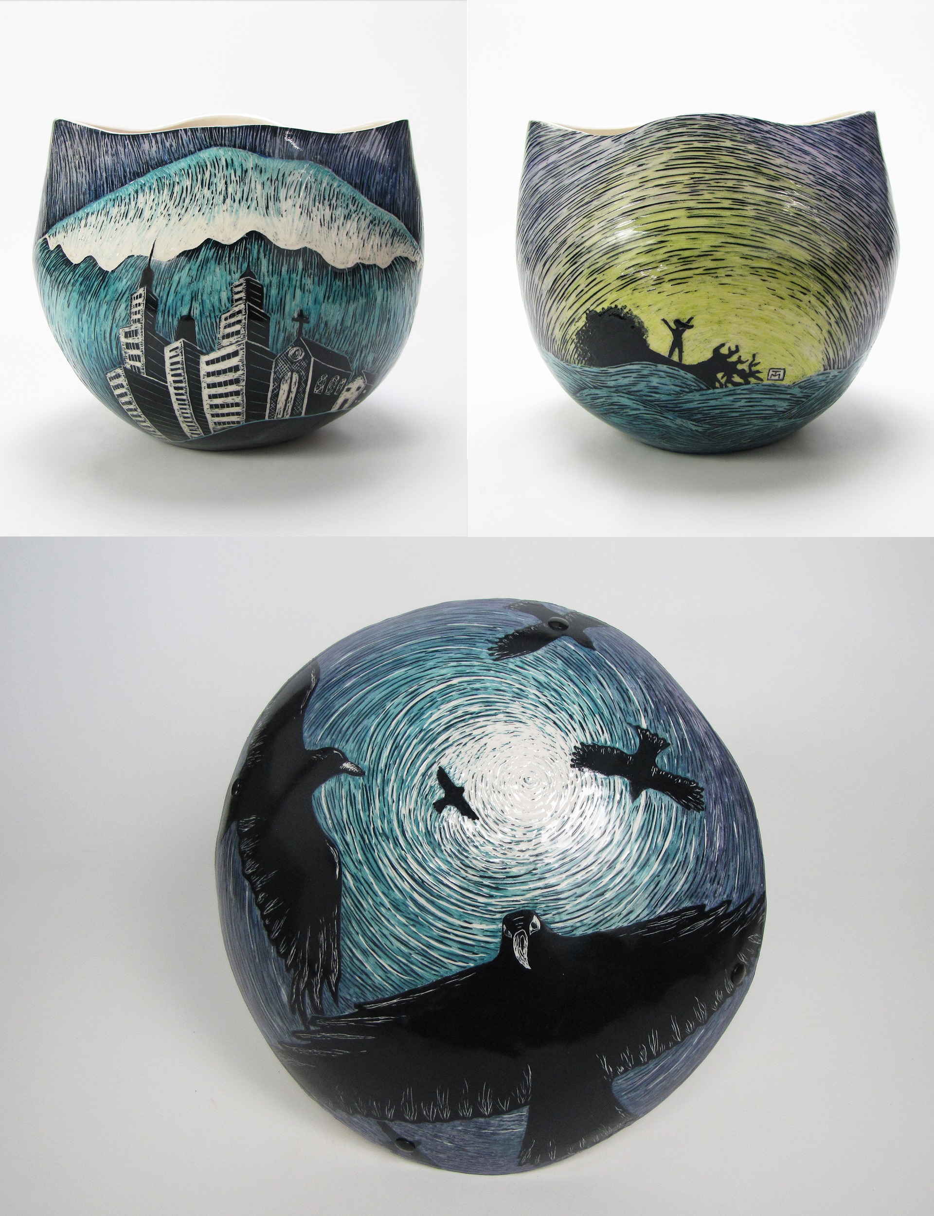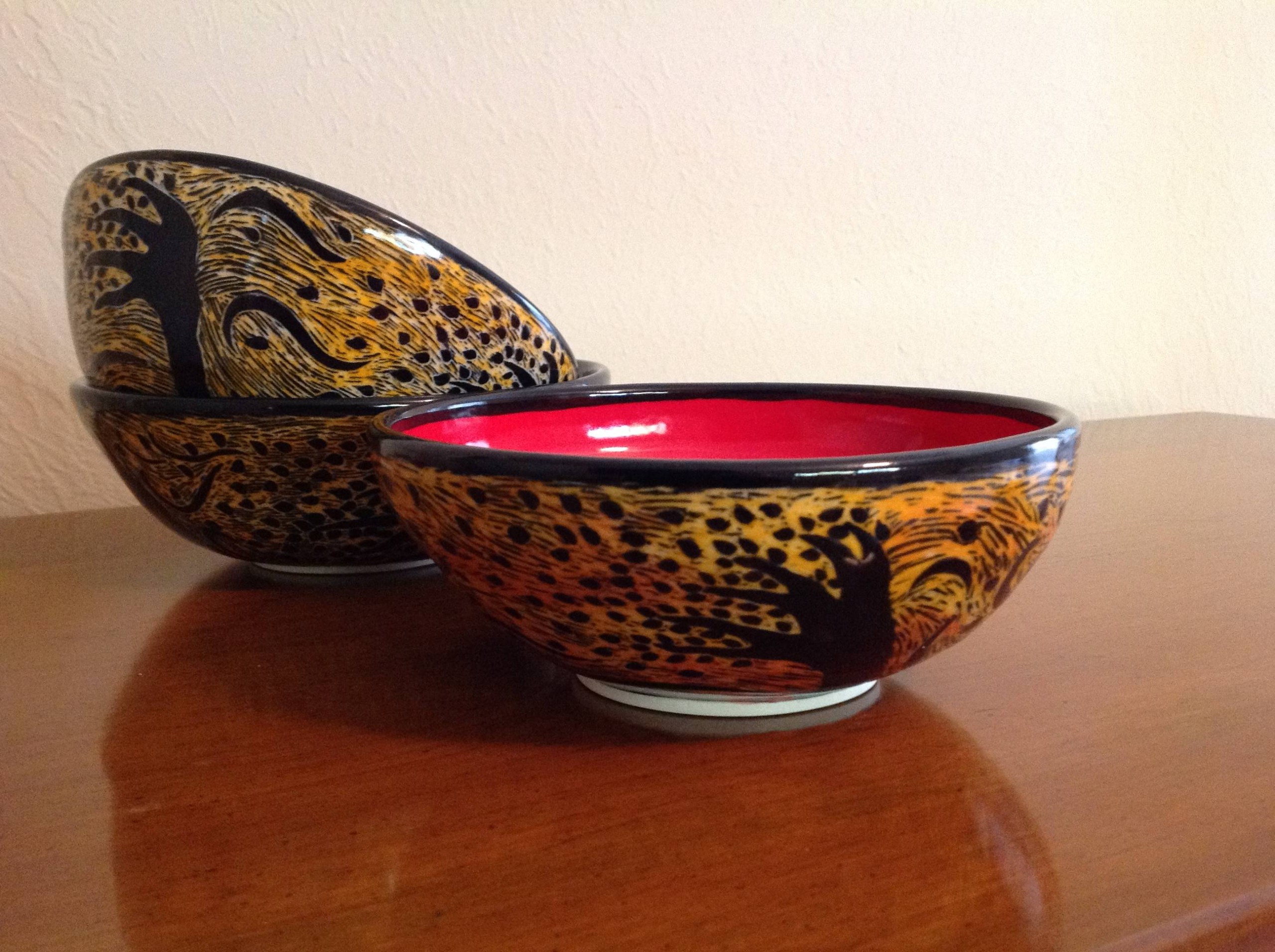 During this same time a visiting sgraffito artist came in and taught a workshop and I instantly fell in love! It brought everything I loved – imagery, form, color, linocut. It was like a lightbulb went off and I couldn’t stop.