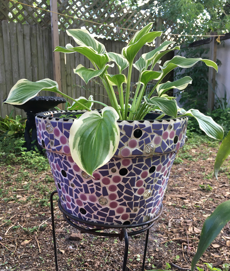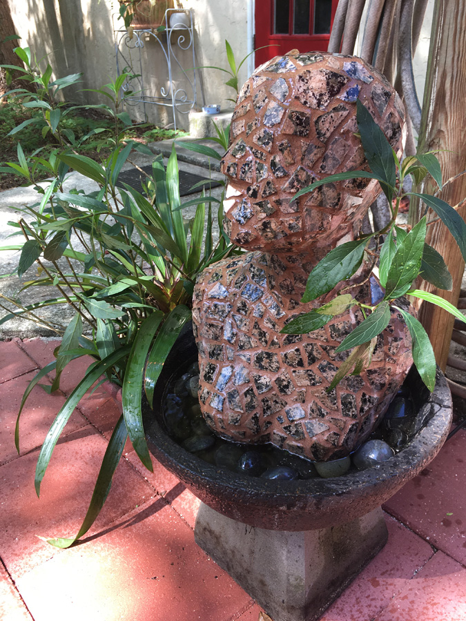 Also, with the help of a friend, I created a patio area with concrete patio blocks in my back yard. We adorned the area by resurrecting some of my outdoor sculpture I had done years ago, which had been overgrown by weeds and webs. Potted plants, some in tiled pots which were also my creations, add foliage and color.