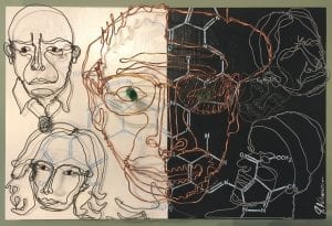 This month I will be participating in the theme show “Please Stand By: a TV Show Exhibit” at MIZE Gallery in St. Petersburg. I am thrilled to be a first-time exhibitor at this fabulous gallery and join a group of wildly creative artists. The TV show I chose to depict is “Breaking Bad”. Please see the attached image for a sneak peek of my piece; the portraits of the show cast members are created in wire and protrude forward into space in my usual 3-dimensional way. The concept of the piece is to show the “good” side of the lead character, Walter White, juxtaposed against the “bad” or dark side of his persona, Heisenberg.