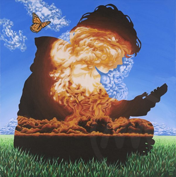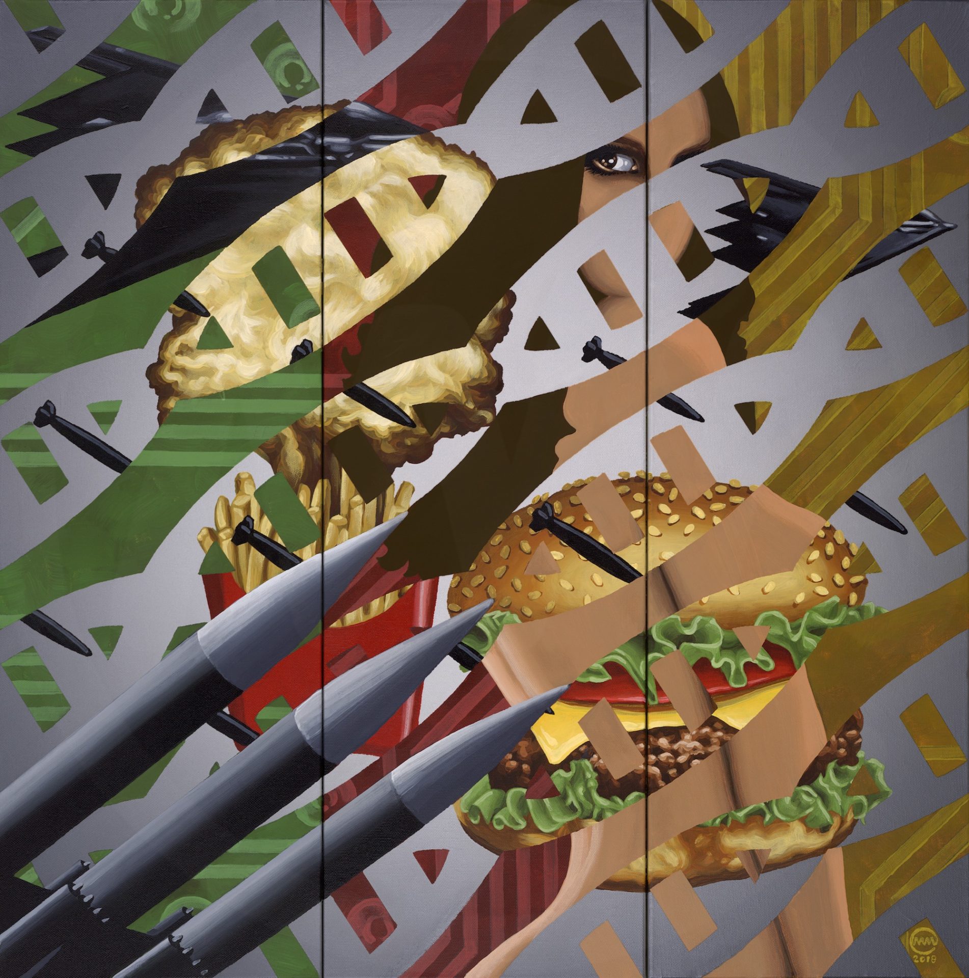Now, all this connectivity is wonderful—especially right now. But… close friends and fans of my art may know I have a bit of a love / hate relationship with a lot of modern tech. Some of our recent so-called “advancements” have a bit of a dark side, and can often carry some concerning side-effects—like screen-addiction, cyber-bullying, misinformation, propaganda, privacy issues and even job depletion via the rising use of automation. These are some of the issues I tend to explore in my paintings, as in the pieces seen above (ahem… all available for purchase). Similar themes will also play a role in my new work to be featured in the upcoming Emerging Artist Exhibition in The Gallery at Creative Pinellas this Spring.