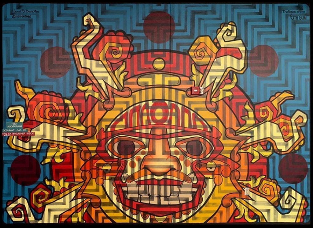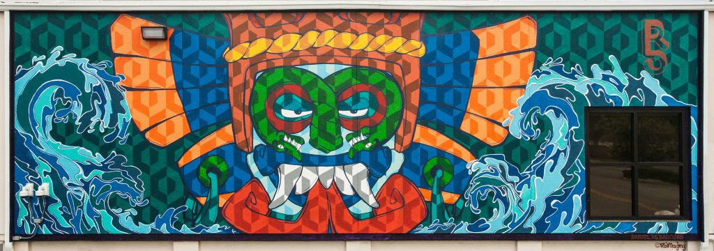 You can explore Daniel Barojas’ 2017 SHINE Festival mural of Tlaloc, the Aztec God of Rain