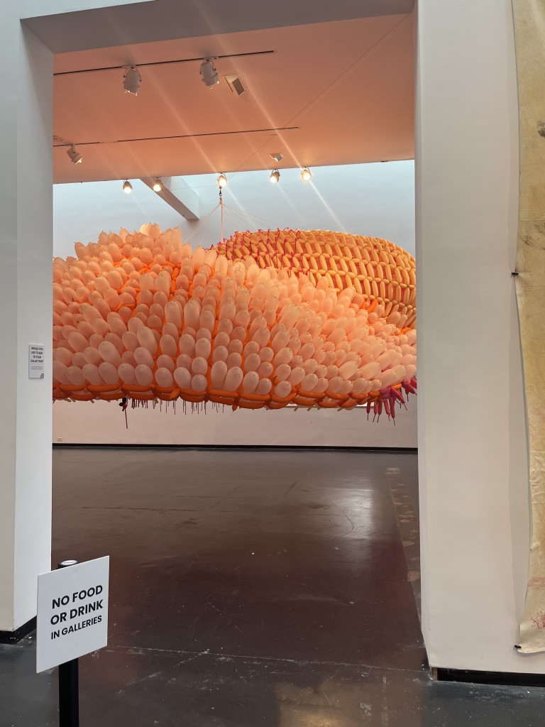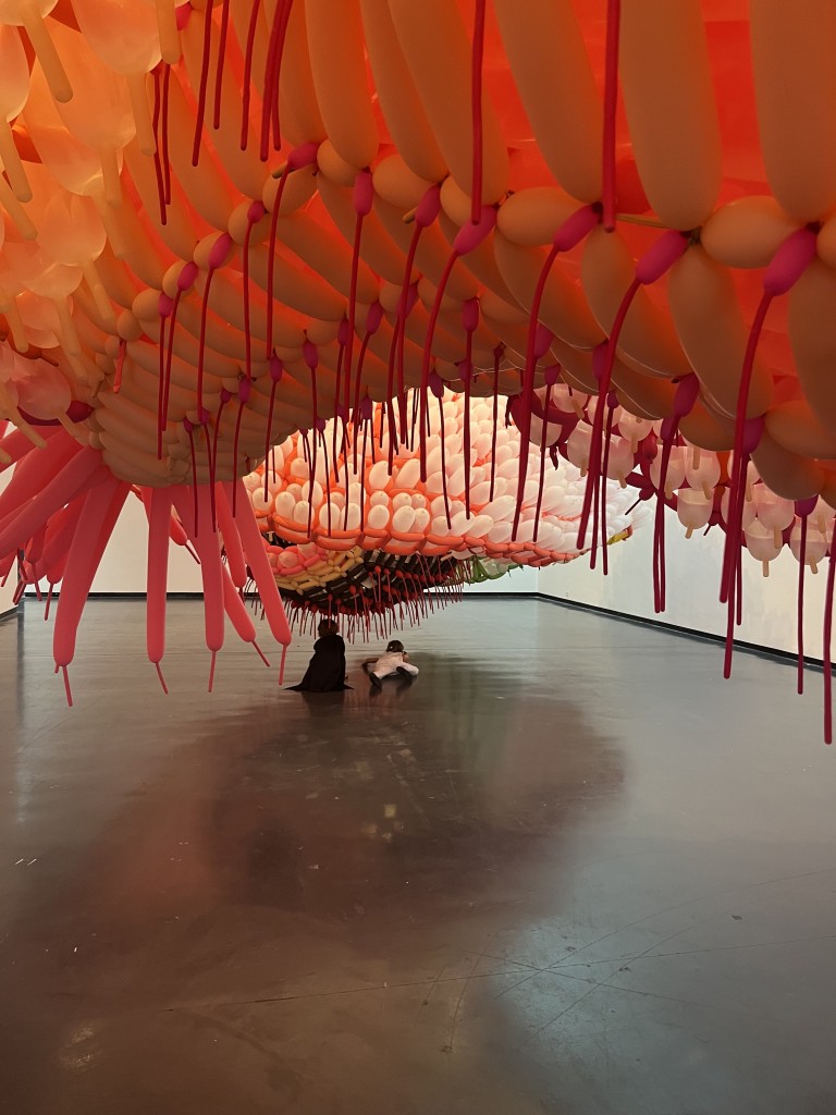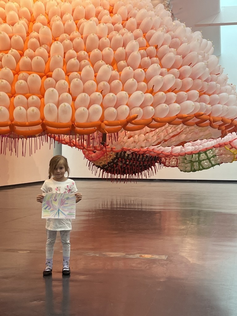 Upon entering the gallery, our eyes were immediately drawn to the large floating sculptures made of intricately woven balloons. My children, Madeline and William, wanted to climb through the installation, and were adamant that it looked sturdy enough to do so.