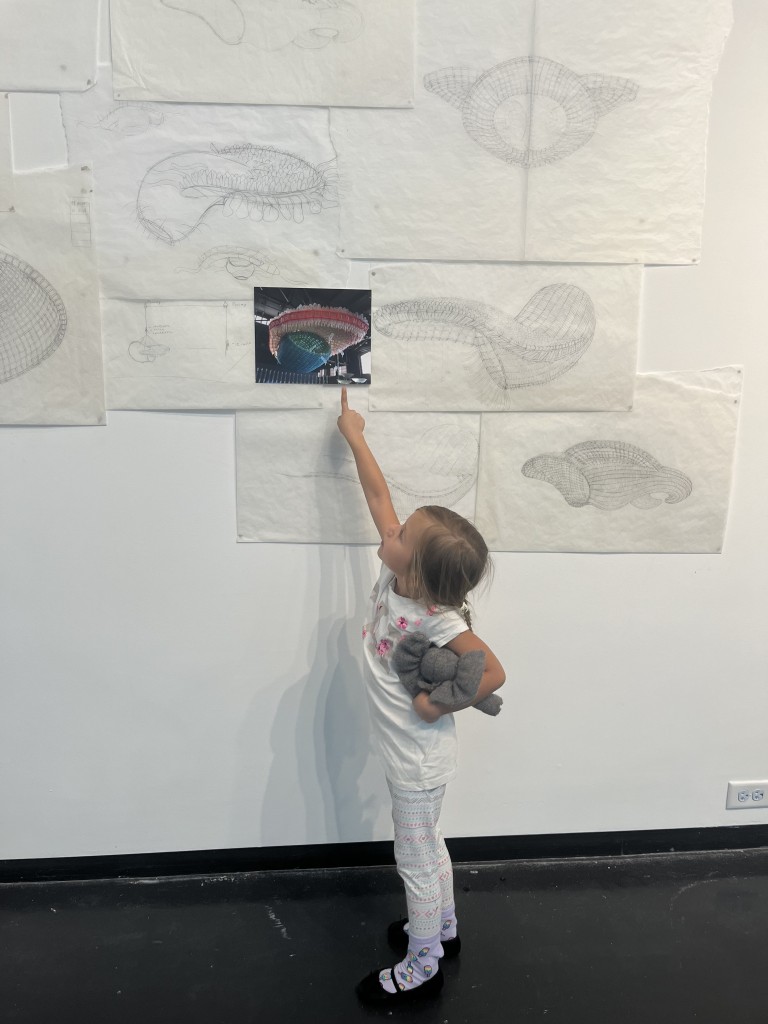Madeline enjoying the drawings and photographs of Jason Hackenwerth’s designs and displays