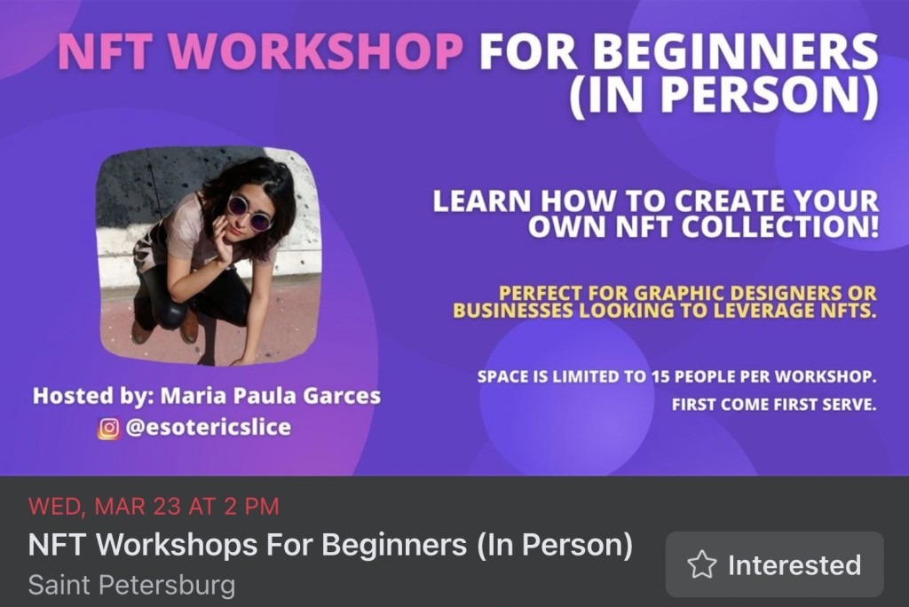 Yes, I’m having another NFT workshop March 23 at NOVA 535 in St. Pete. I have a lot of projects coming up so I won’t be hosting any more workshops for a good bit, so I made it free and open to everyone! Just reach out to me on insta at @esotericslice to get registered.