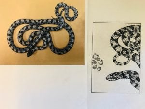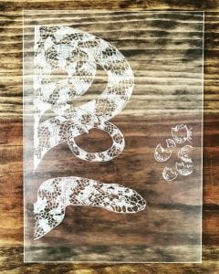 To the right is the final drawing I used as a key image to place under the acrylic and etch on top. To the left is a reference photo I used to accurately render proportions and patterns of the Florida short-tailed snake.