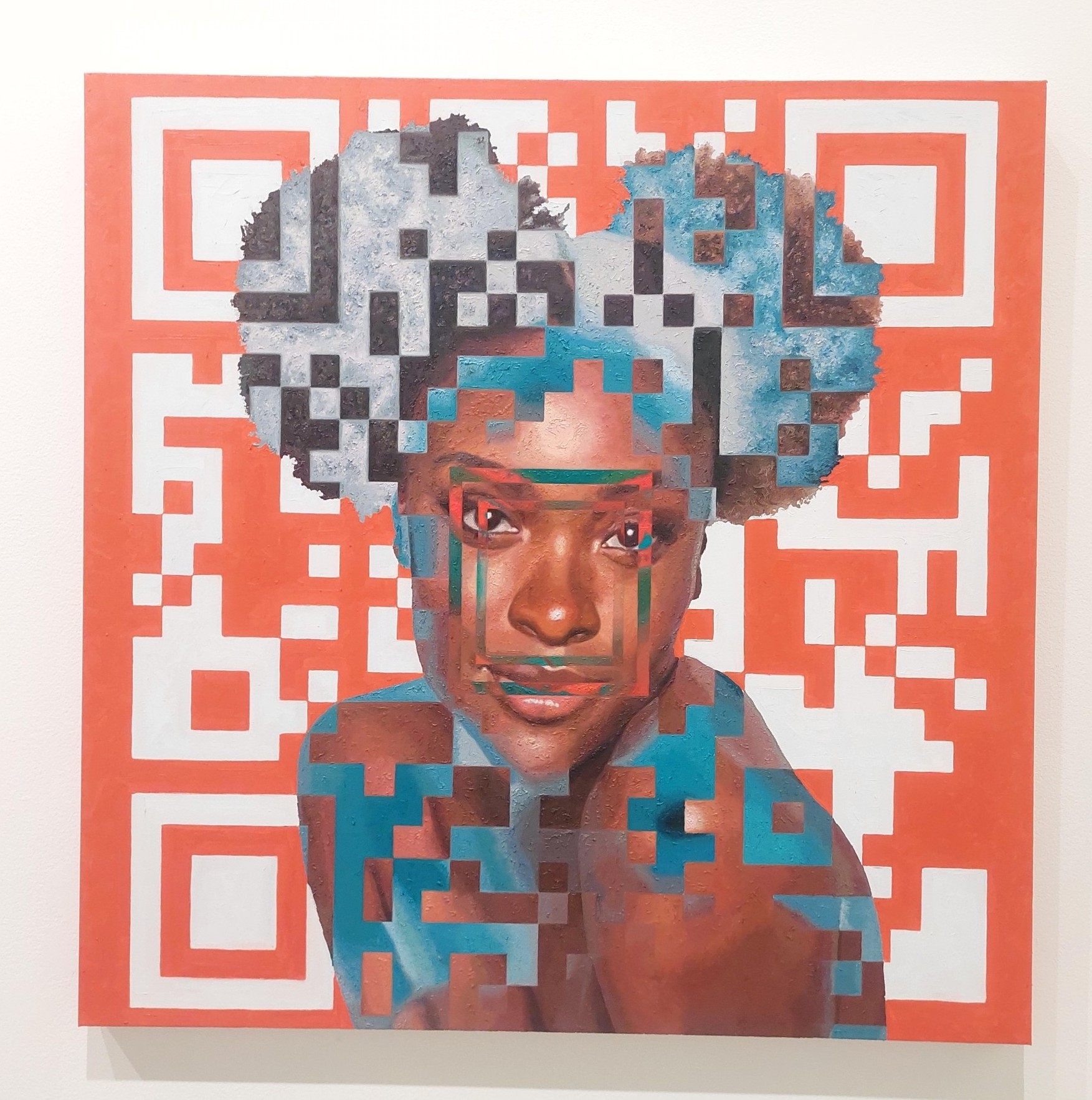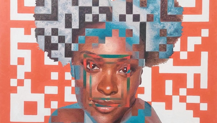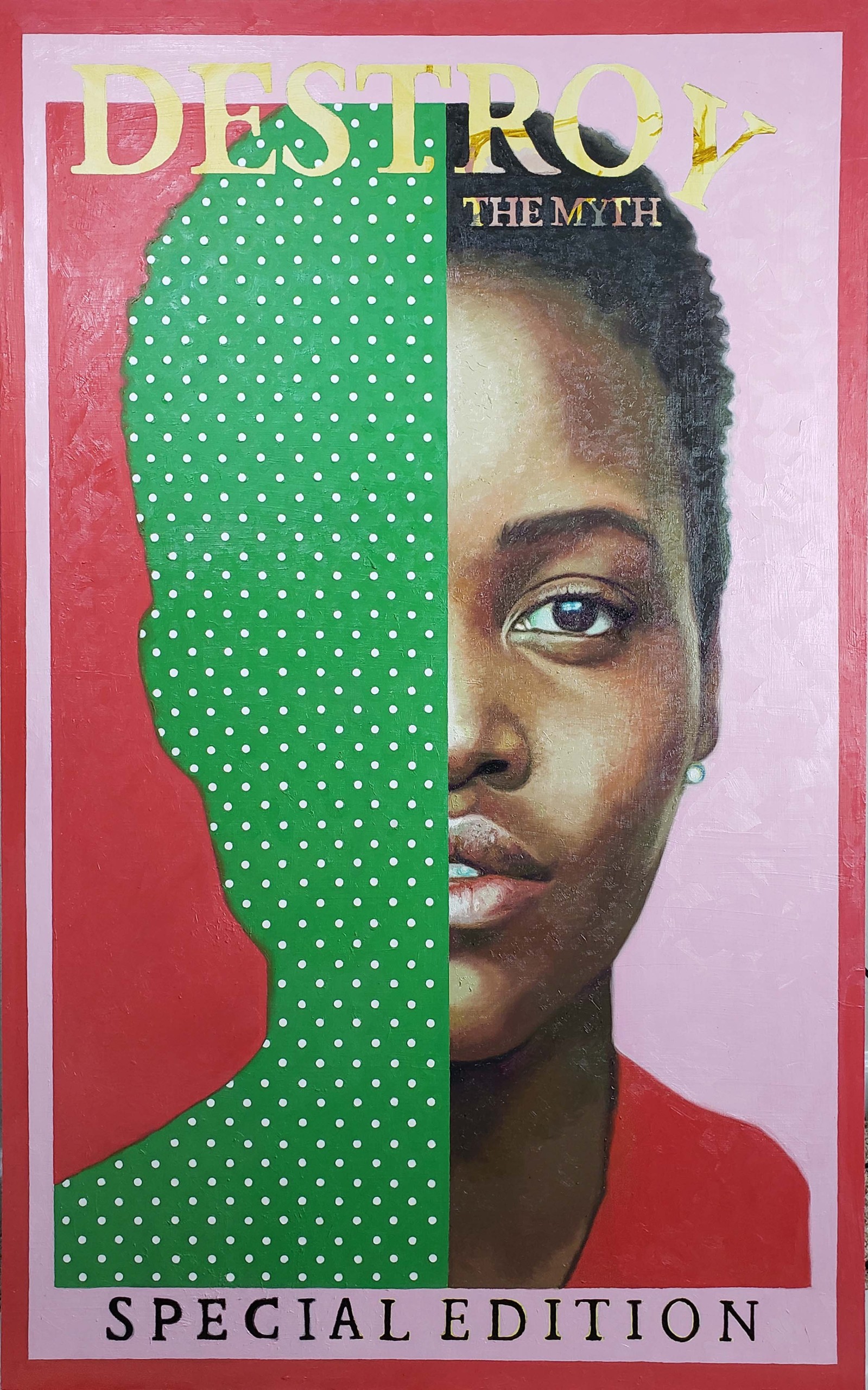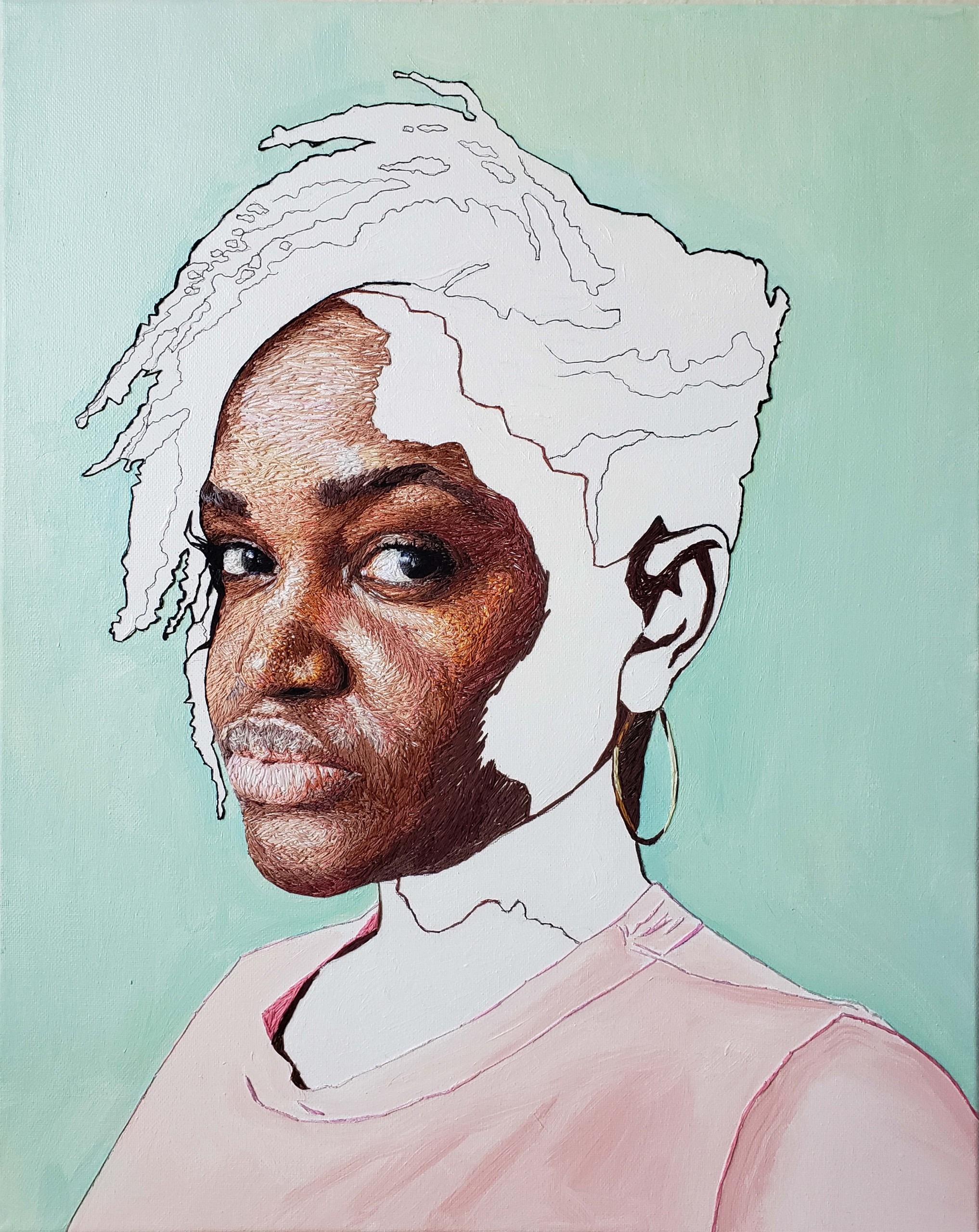 Nneka Jones’ mixed-media self-portrait Destroy the Myth features hand-embroidery on a canvas that focuses on her partially drawn face. Of the work the Trinidad and Tobago-born artist shared, she says –