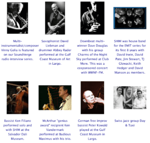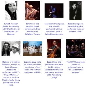EMIT enjoyed presenting 40+ concerts at the Salvador Dali Museum in its early days. It seemed like a great match but the partnership dwindled away after the museum moved to its new location. Most concerts are now given at the Palladium Theater. The artists presented over the years include international leading innovators in music in addition to area musicians stretching the boundaries. Here are a few artists that EMIT has presented: