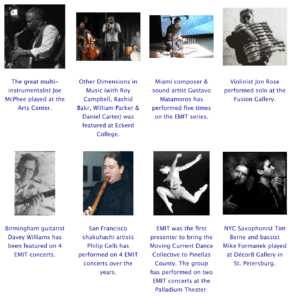 EMIT has partnered with the Subtropics New Music Festival, Studio@620, The Florida Orchestra, BONK, Al Downing Tampa Bay Jazz Association, The Gulf Coast Art Museum, New College-USF, The Palladium Theatre, SPIFFS, Salvador Dali Museum, WMNF-FM, Leepa-Rattner Museum, Subtropics New Music Festival, C.O.R.E., St. Petersburg College, Eckerd College, St. Petersburg Arts Alliance and private galleries and businesses to present concerts of innovative and adventurous music.