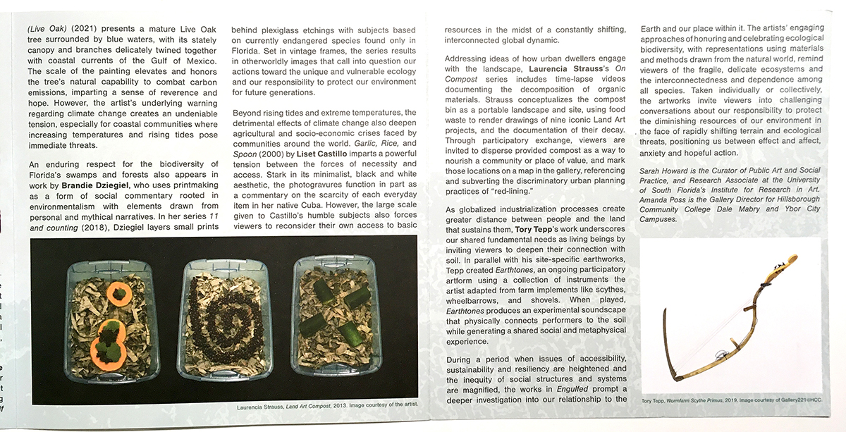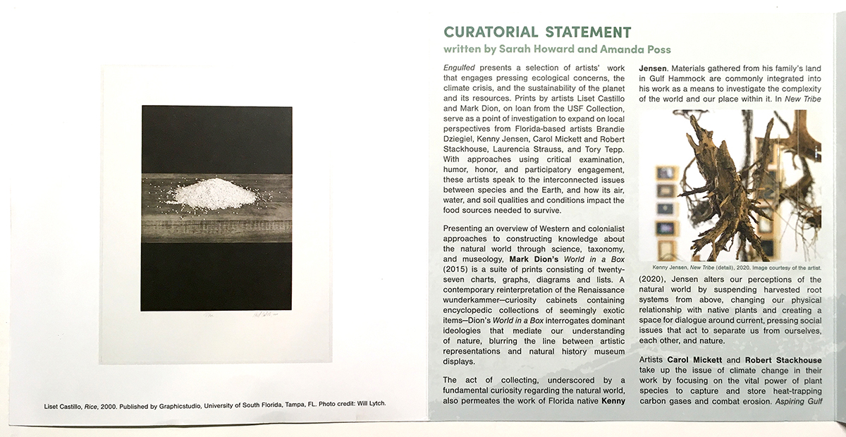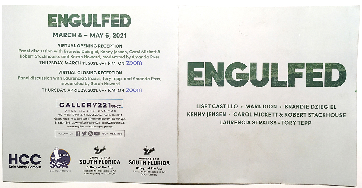 “Engaging issues around climate crisis, sustainability, and pressing ecological concerns, Engulfed is a group show that highlights artistic responses to our evolving environmental issues. Co-curated by Sarah Howard and Amanda Poss, the exhibition features a range of regional voices alongside select works from the Permanent Art Collection of the USF Contemporary Art Museum. Featured artists include: Liset Castillo, Mark Dion, Brandie Dziegiel, Kenny Jensen, Carol Mickett & Robert Stackhouse, Laurencia Strauss and Tory Tepp.”