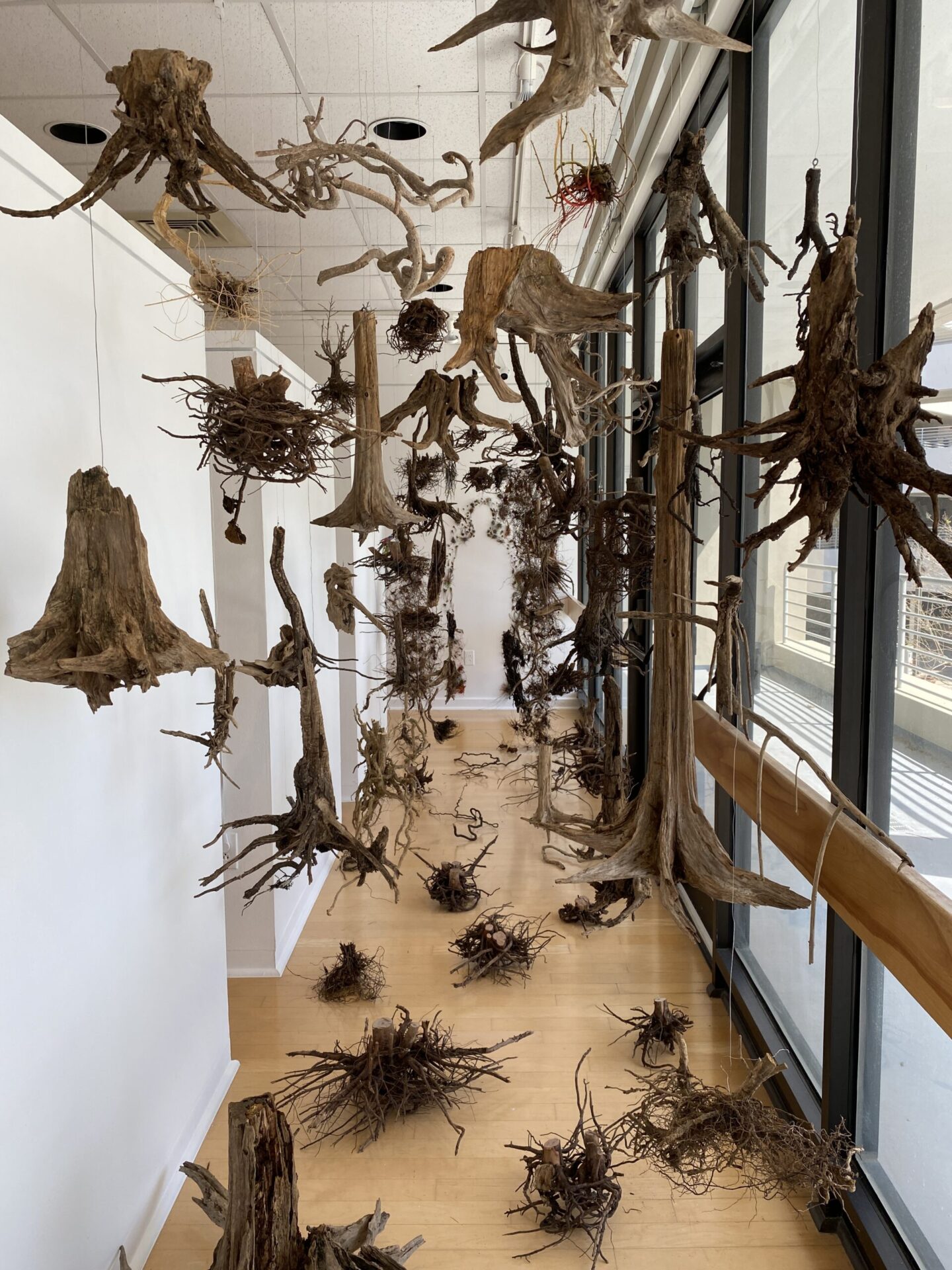 …“The act of collecting, underscored by a fundamental curiosity regarding the natural world, also permeates the work of Florida native Kenny Jensen. Materials gathered from his family’s land in Gulf Hammock are commonly integrates into his work as a means to investigate the complexity of the world and our place within it. In The Understory (2021), Jensen alters our perceptions by suspending harvested root systems from above, changing our physical relationship with native plants and creating a space for dialogue around current, pressing social issues that act to separate us from ourselves, each other, and nature.”