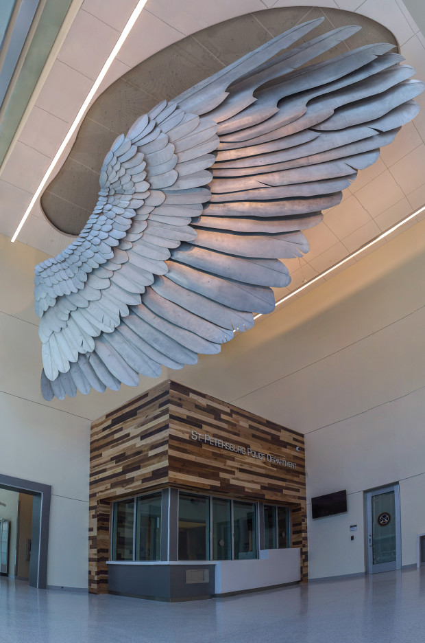 Recently we completed two large commissions for the new police headquarters in downtown St. Petersburg. The building’s lobby features “Shielded” – a 30-foot eagle’s wing hand crafted with 240 aluminum feathers and suspended above the glass-walled grand vestibule.