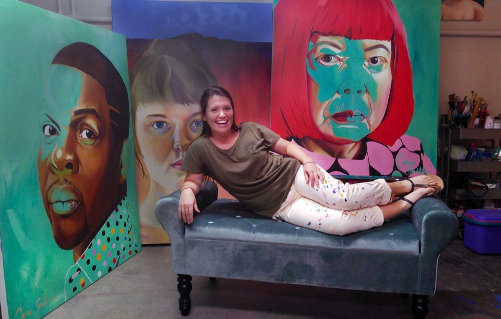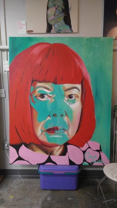 Carrie Smith has a painting studio filled with big portraits at the ArtsXchange in St. Pete’s Warehouse Arts District. She keeps it clean and organized, and it’s a fun spot to visit while you make the Second Saturday Art Walk rounds.