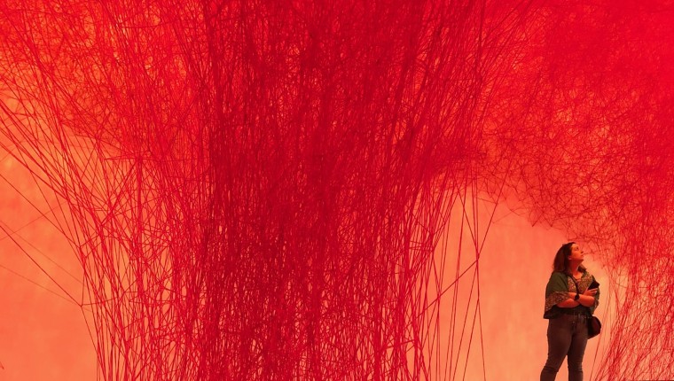 One of the installations, Uncertain Journey, is a sea of red, created with miles of red wool threads strung like a spiderweb on acid. The artist explains, “Threads become tangled, intertwined, broken off, unraveled. They constantly reflect a part of my mental state, as if they were expressing the state of human relationships.”