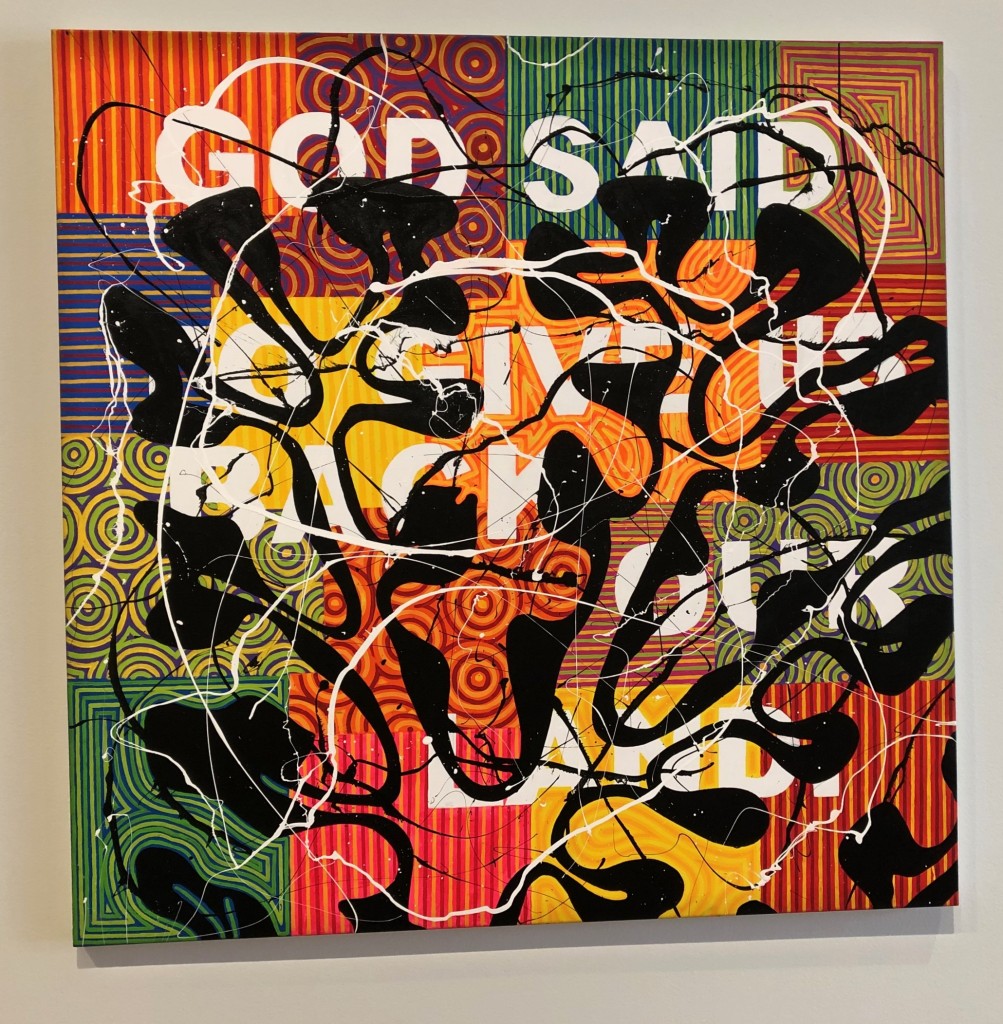 Two paintings from Richard Bell – “Who made God savage” and “Bible for dummies” were in the exhibition Courage and Beauty, curated from the James C. Sourris AM Collection.